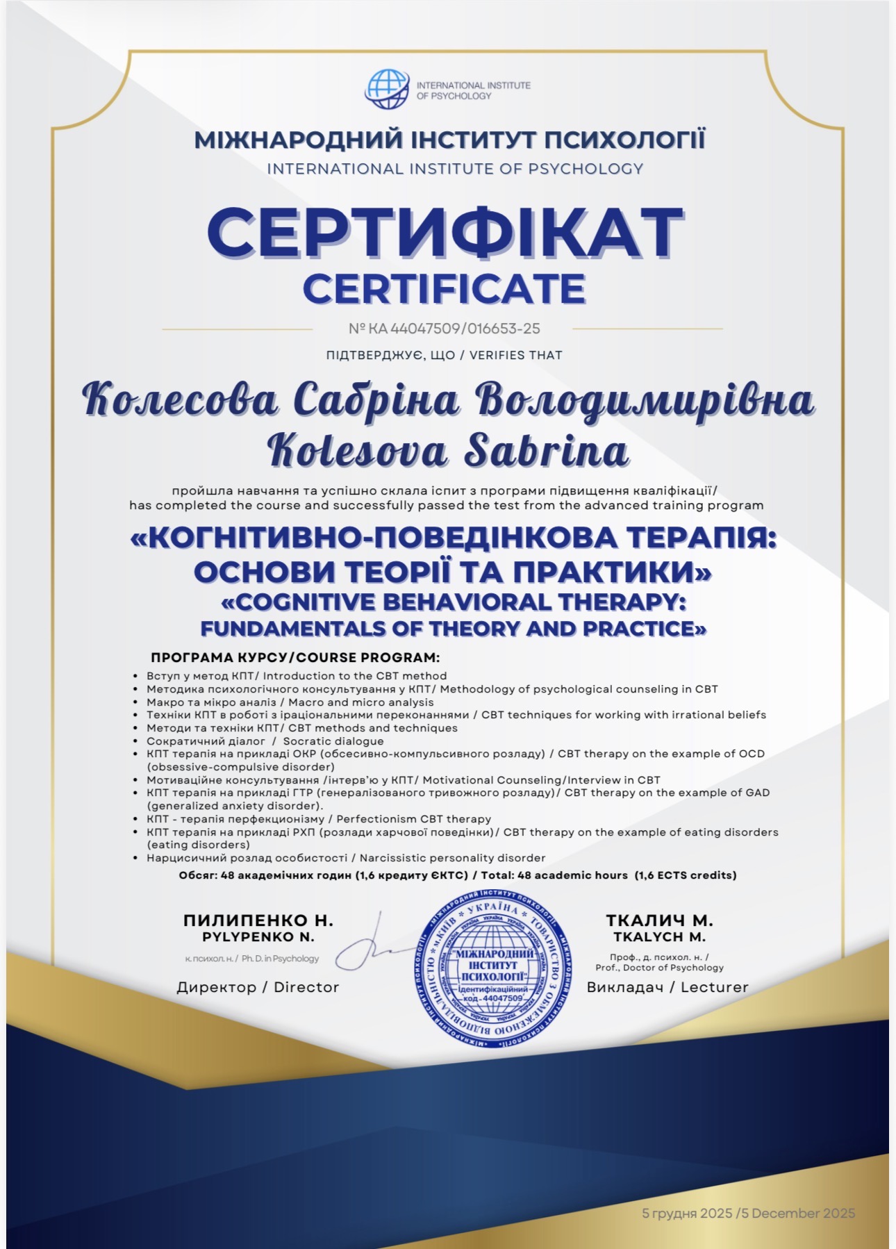 - Сертифікат "Когнетивно-поведінкова терапія: основи теорії та практики" з 2025 року