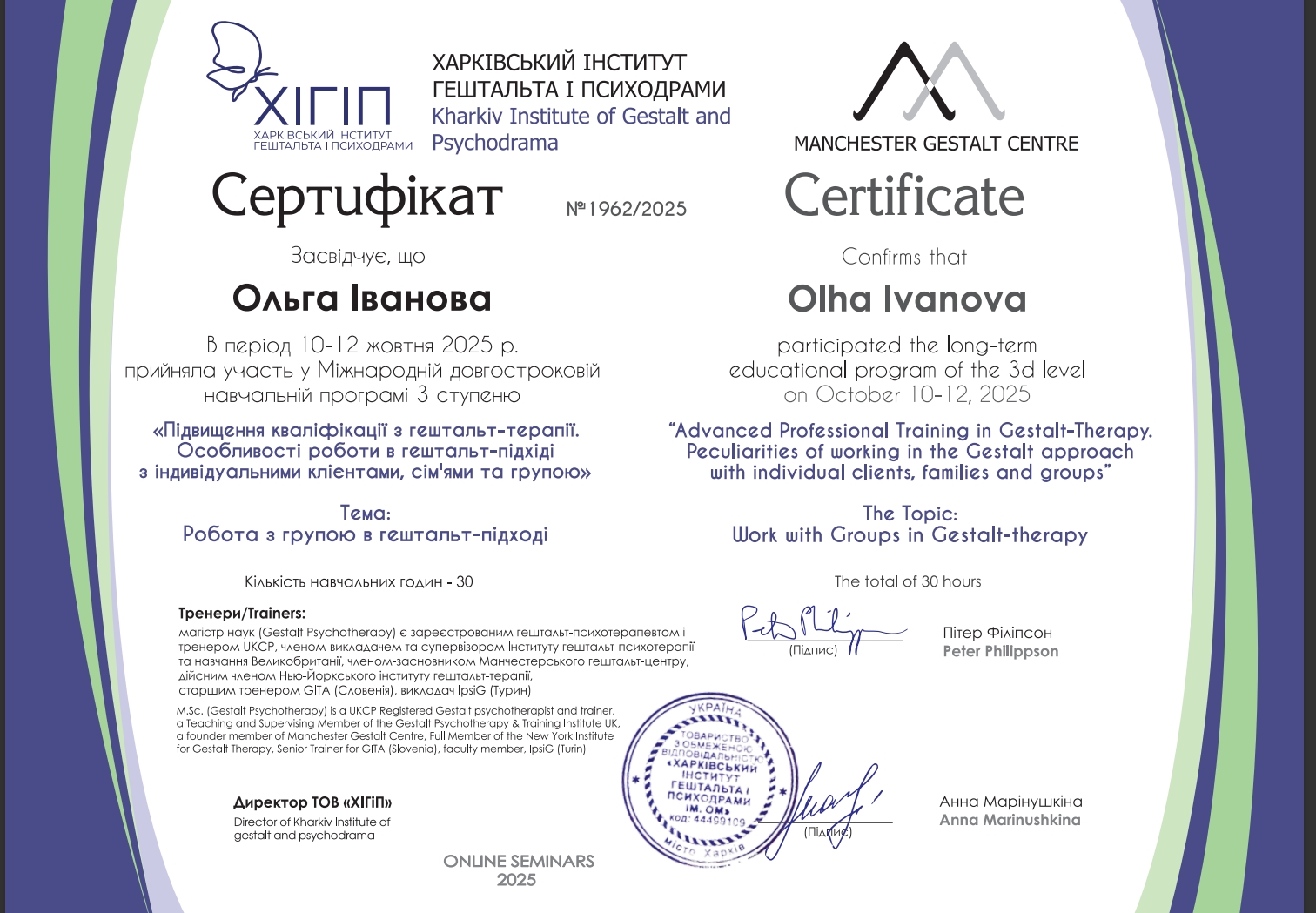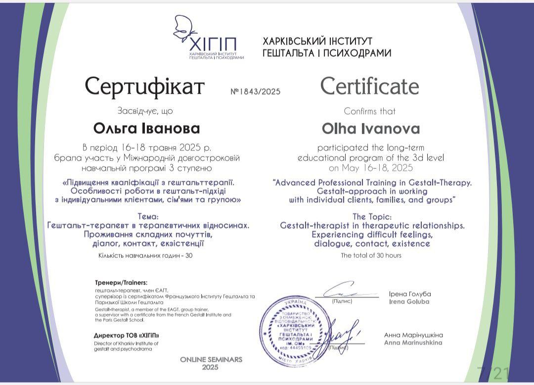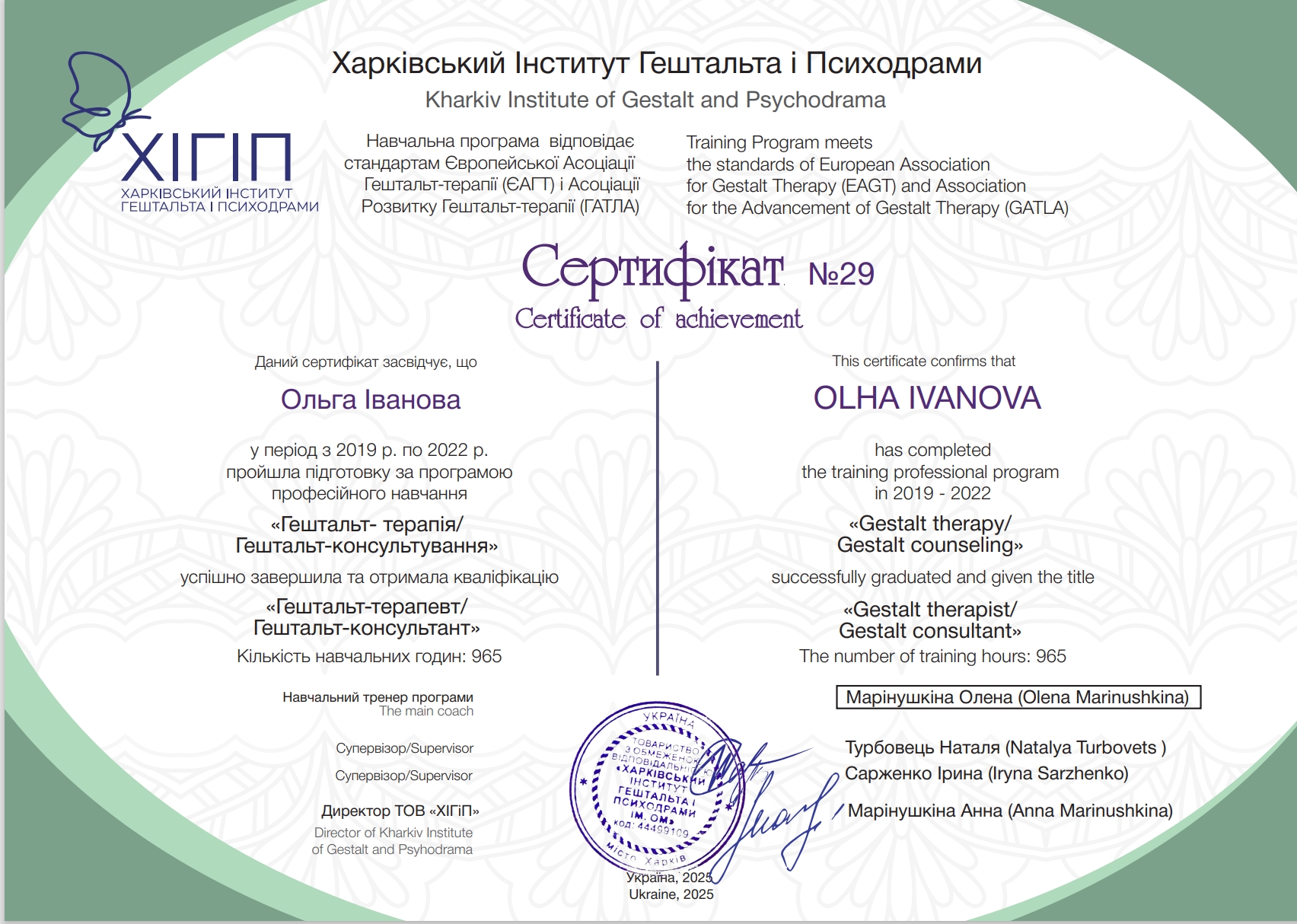 - Сертифікат Сертифікат №29 «Гештальт-терапевт/ Гештальт-консультант» з 2025 року