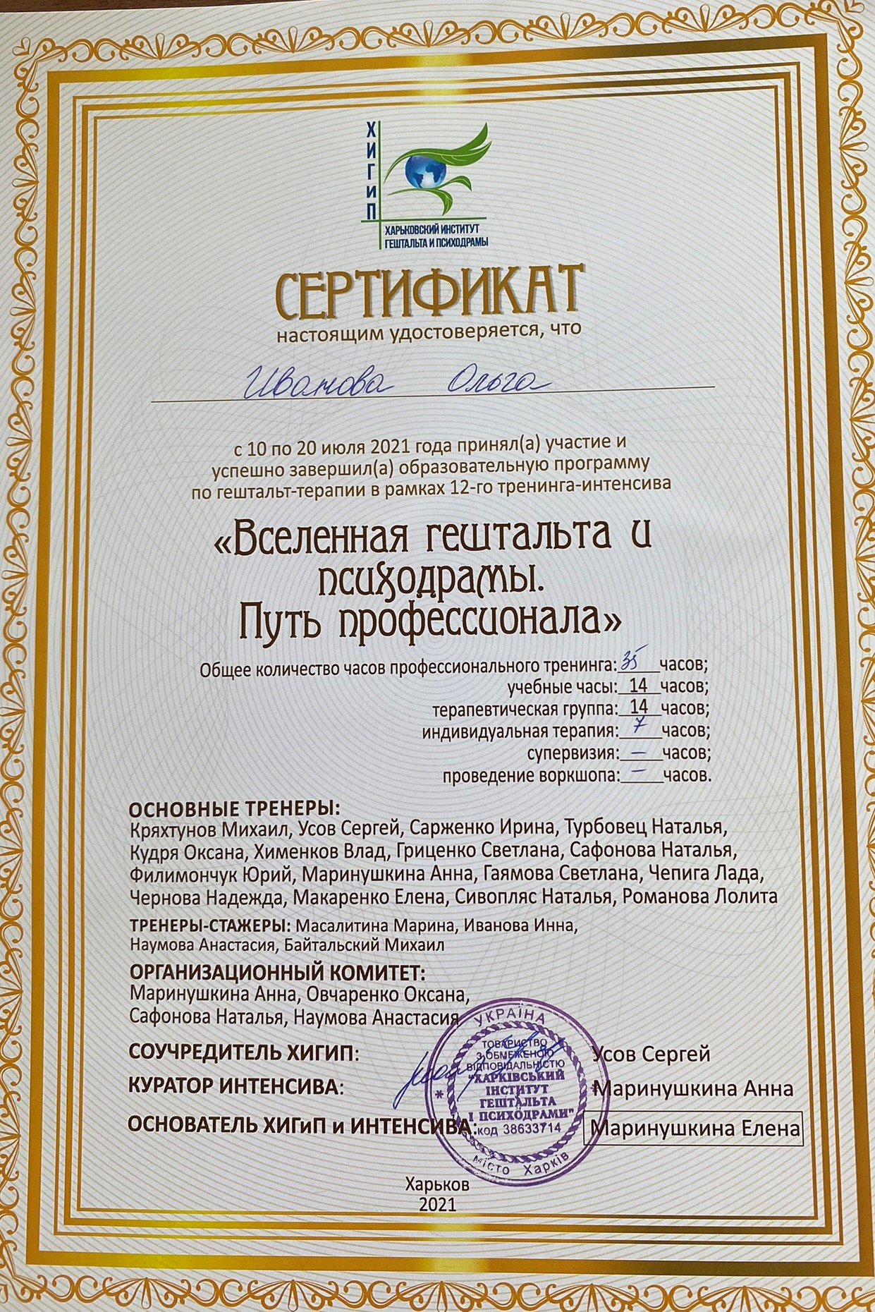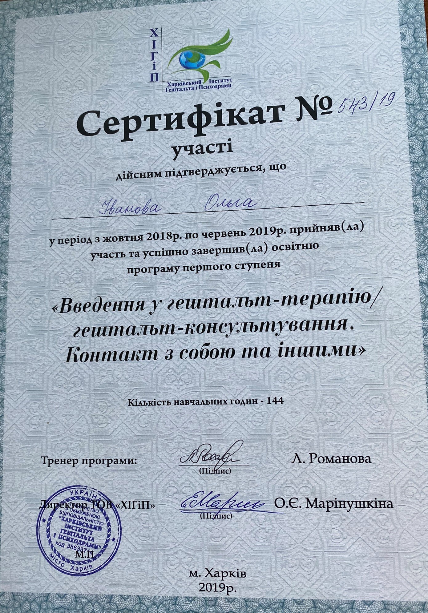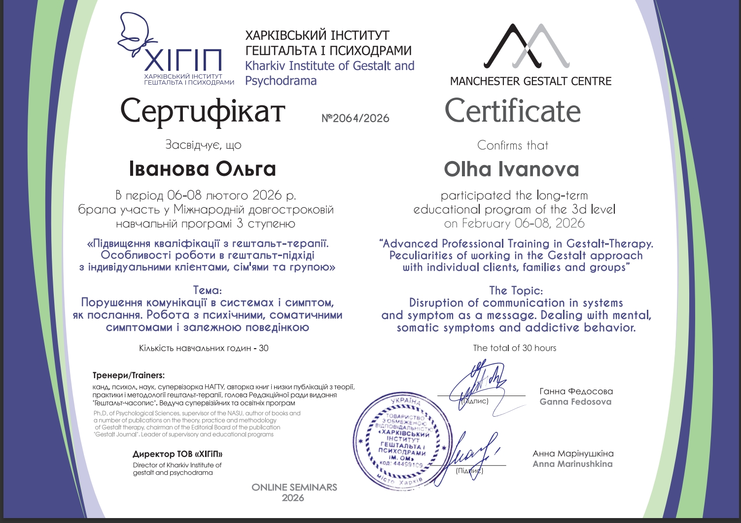 - Сертифікат Сертифікат №29 «Гештальт-терапевт/ Гештальт-консультант» з 2025 року