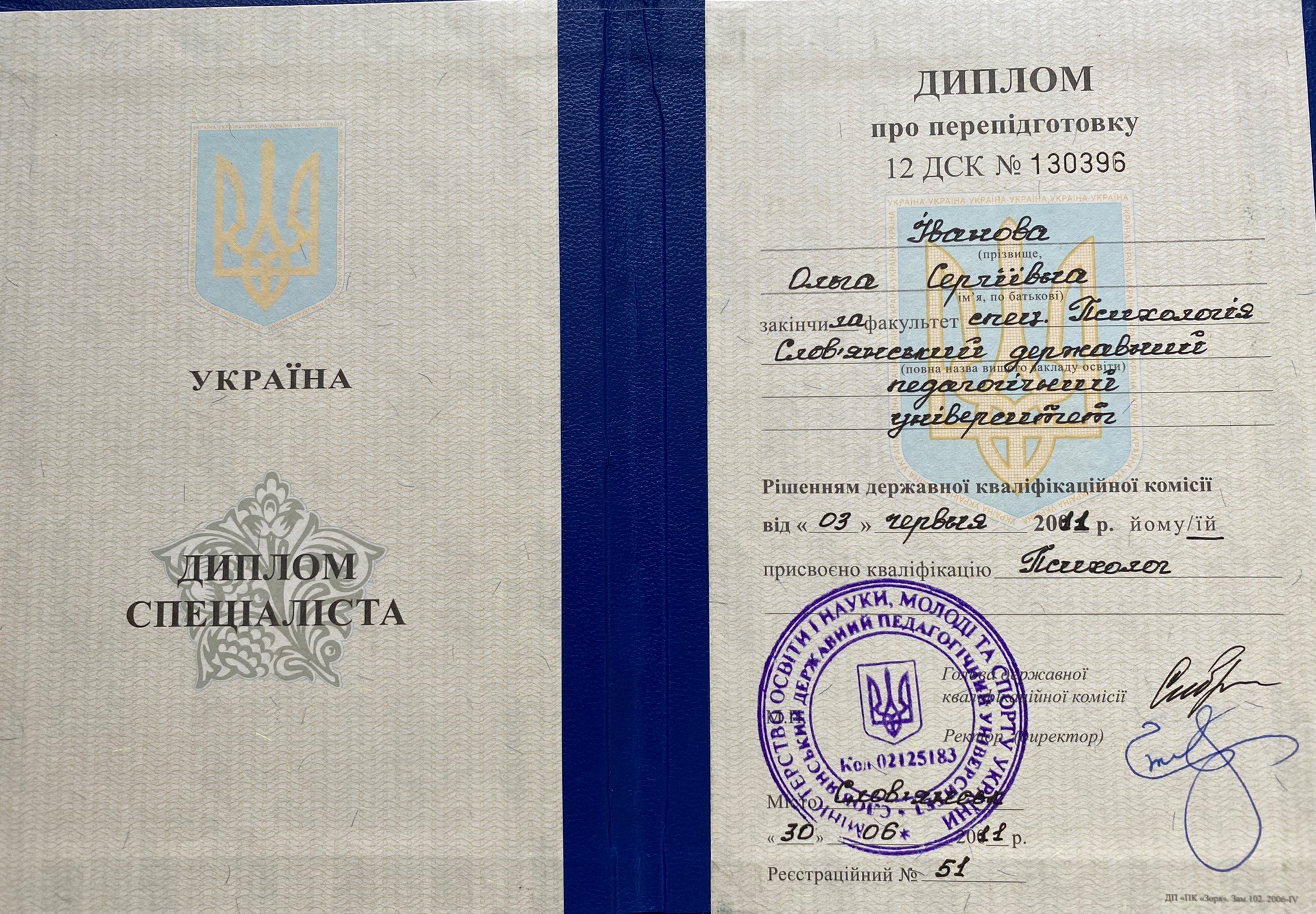 - Слов'янський державний педагогічний університет, спеціальність Психологія , кваліфікація Психолог в 2011