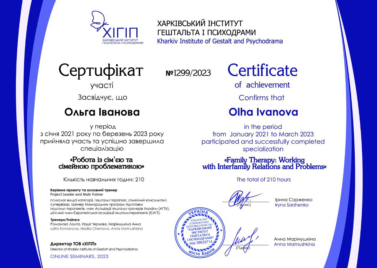 - Сертифікат Сертифікат № 1299\2023 спеціалізація "Робота з сім'єю та сімейною проблематикою" з 2023 року