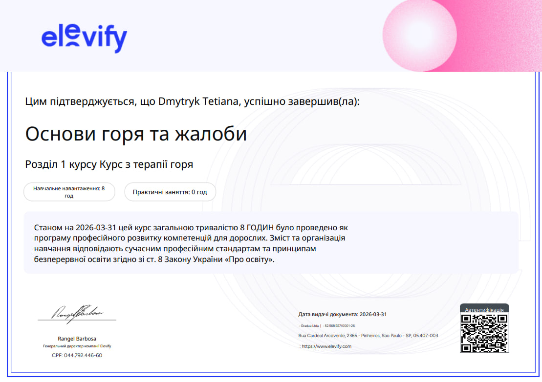 Моя робота — це уважне слухання, рефлексія та підтримка, без осуду і готових «рецептів». Разом ми досліджуємо ваш внутрішній світ, розплутуємо те, що турбує, і шукаємо способи жити більш повно, зберігаючи контакт із собою.