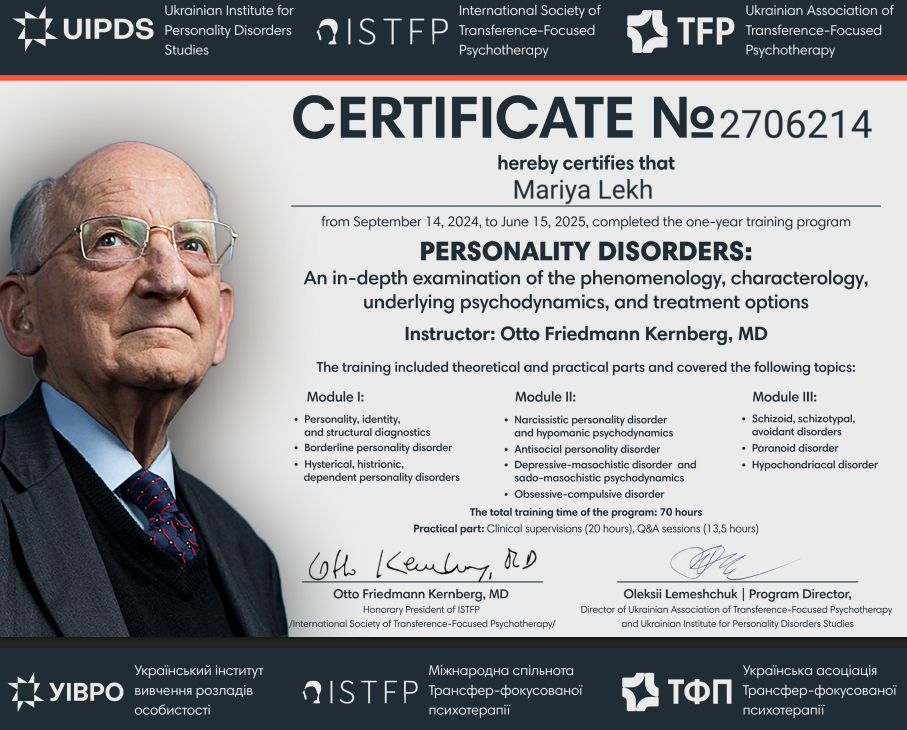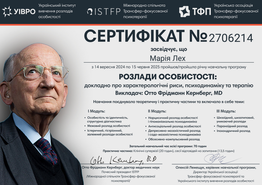 - Сертифікат Отто Кернберг. Розлади особистості. Річний курс з 2025 року