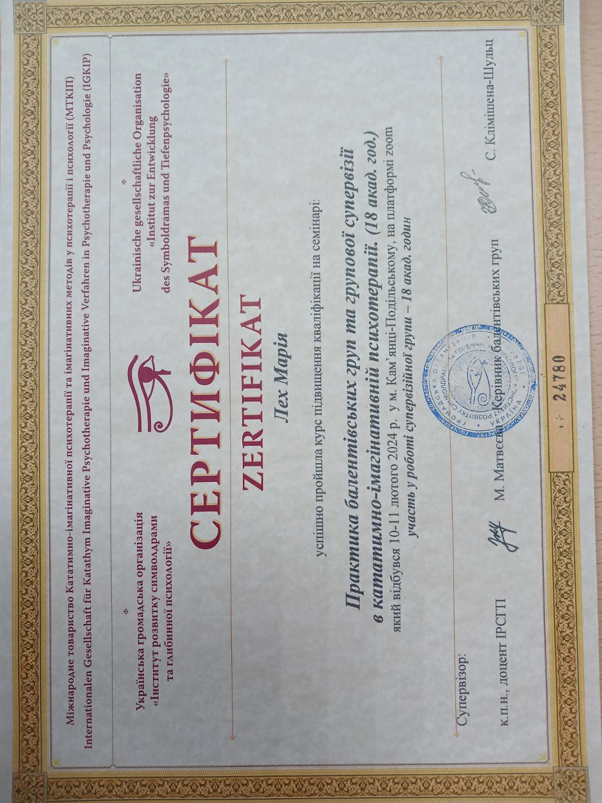 - Сертифікат Про проходження курсу супервізій з 2024 року