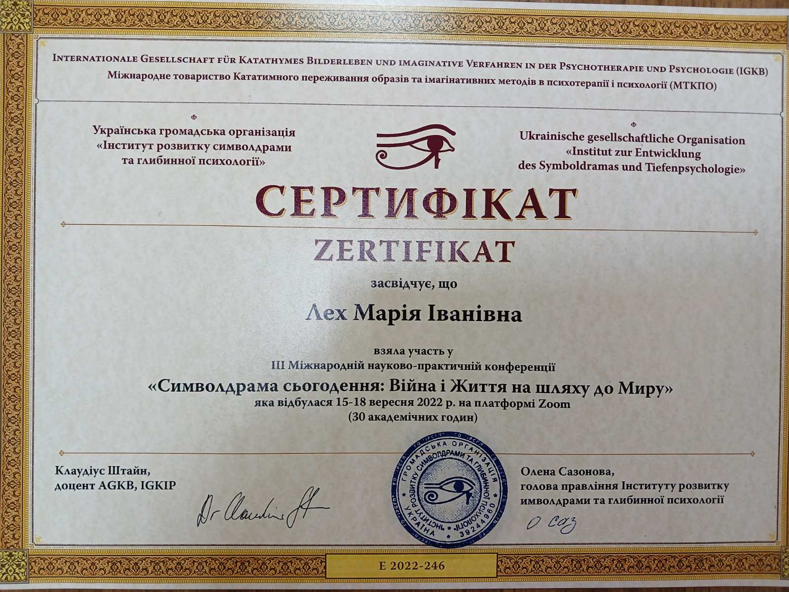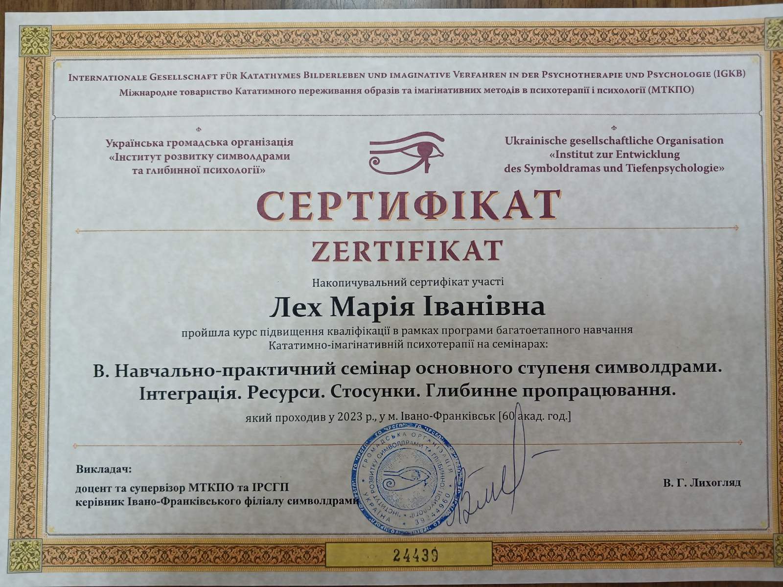 - Сертифікат Навчально-практичний семінар основного ступені символдрами. Інтеграція. Ресурси. Стосунки. Глибинне пропрацювання з 2023 року