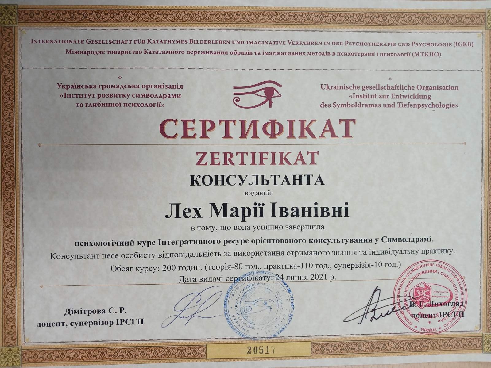 - Сертифікат Консультанта у методі Символдрама з 2021 року