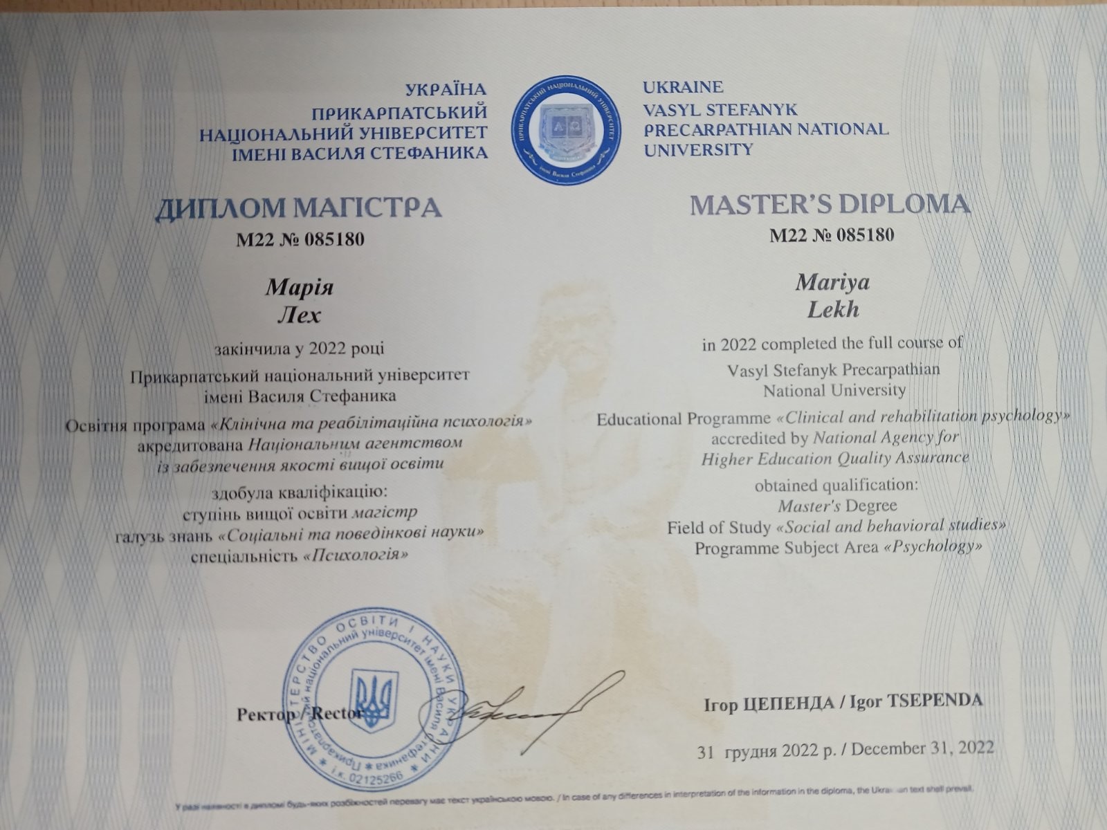 - Сертифікат Диплом магістра з клінічної психології з 2022 року