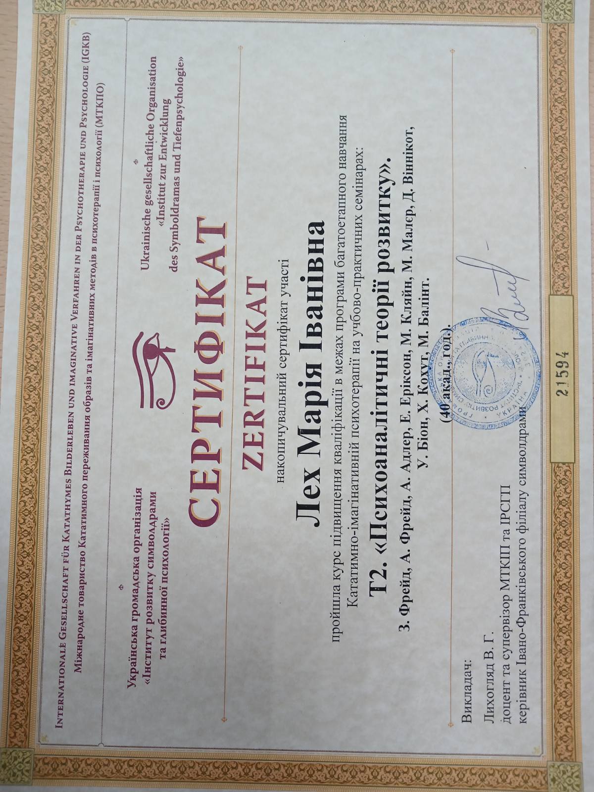 - Сертифікат Психоаналітичні теорії розвитку з 2023 року