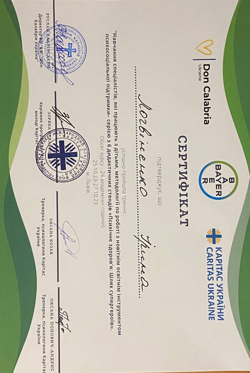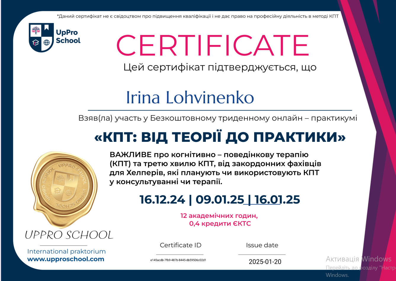 Працюю з повагою, емпатією та дотриманням професійної етики. Моє завдання як спеціаліста — не давати готових рішень, а допомагати клієнту знайти власні відповіді та ресурси для змін.