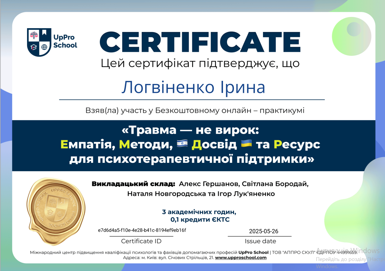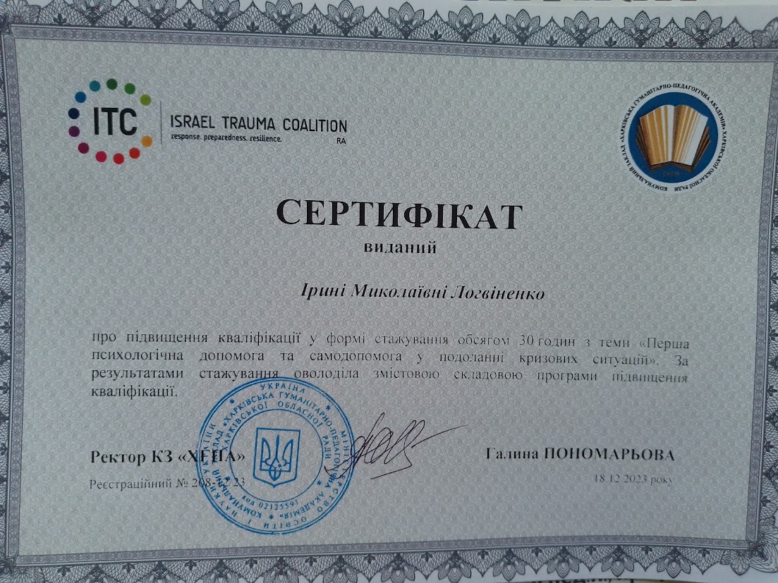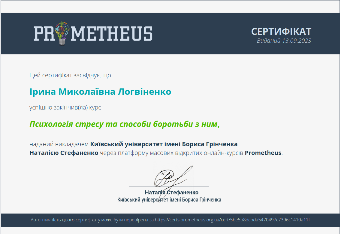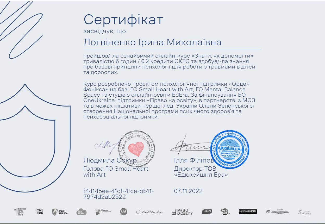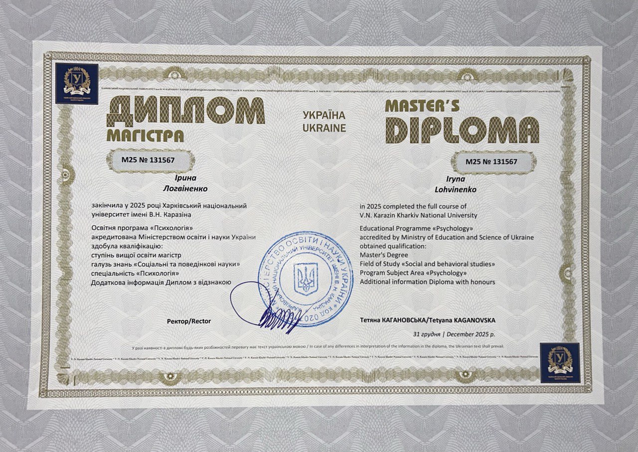 Мене звати Ірина, я – практичний психолог із магістерською підготовкою, випускниця психологічного факультету Харківського національного університету імені В.Н. Каразіна. У своїй професійній діяльності поєдную науковий підхід із глибокою повагою до унікальності кожної особистості. Маю досвід роботи з підлітками та дорослими, зокрема у сфері переживання тривожних станів, емоційного вигорання, кризових періодів життя та питань самоідентичності. Особливий інтерес у моїй професійній діяльності займає тема екзистенційних переживань і впливу соціальних та екологічних змін на психоемоційний стан людини.