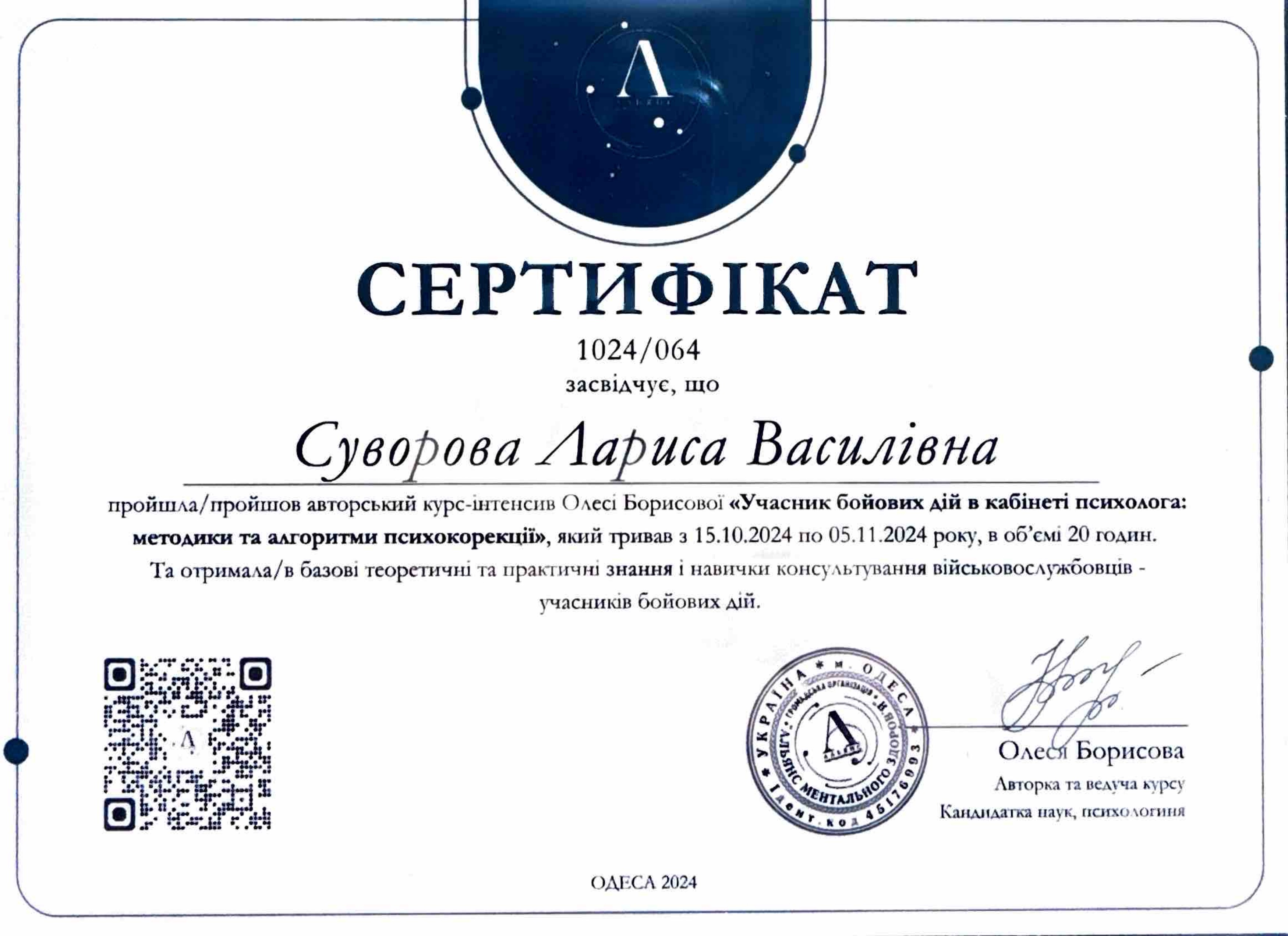 Сертифікат курс "Учасник бойових дій в кабінеті психолога: методи та алгоритми психокорекції" з 2025 року