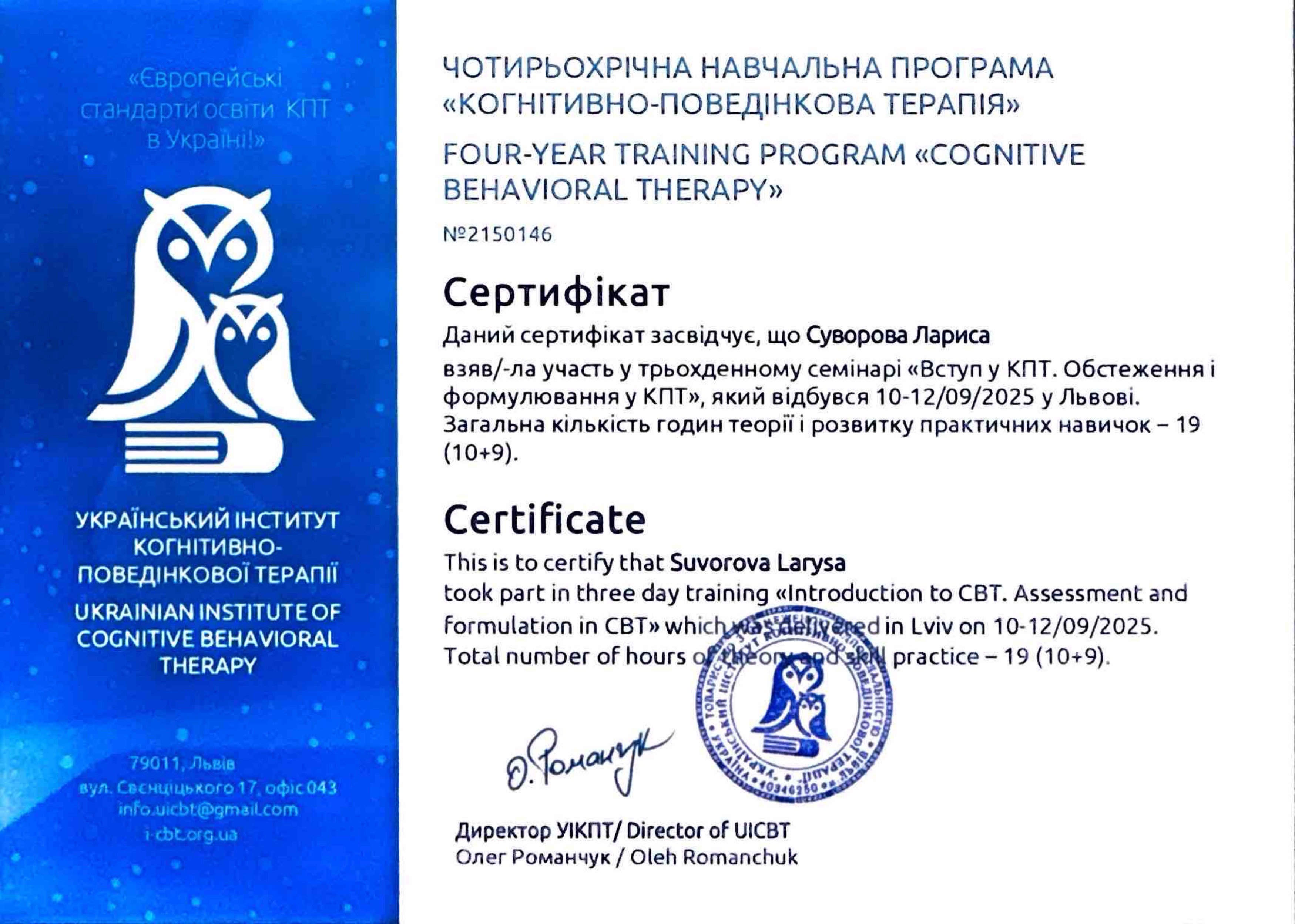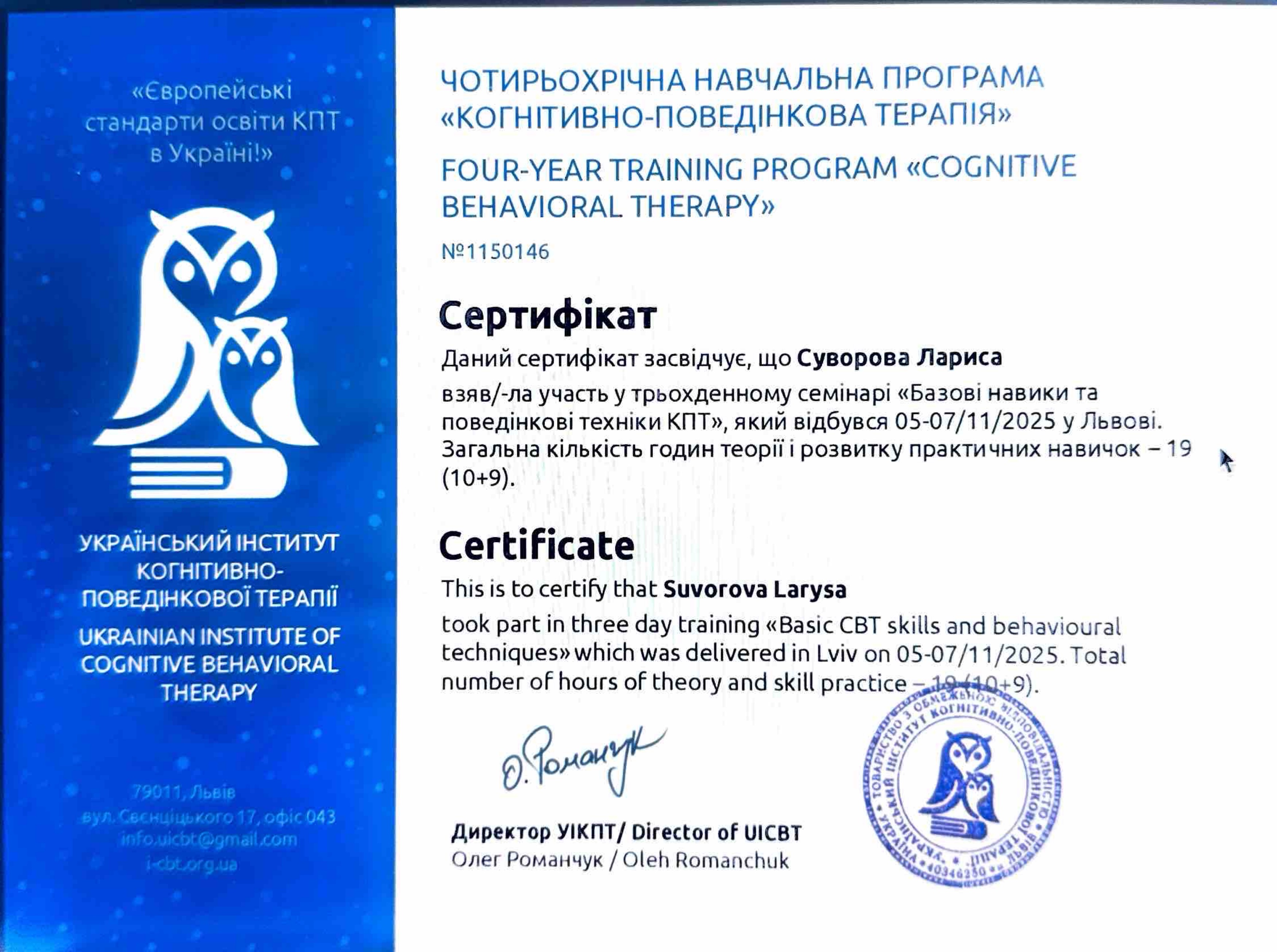 Сертифікат Базові навики та поведінкові техніки КПТ з 2025 року