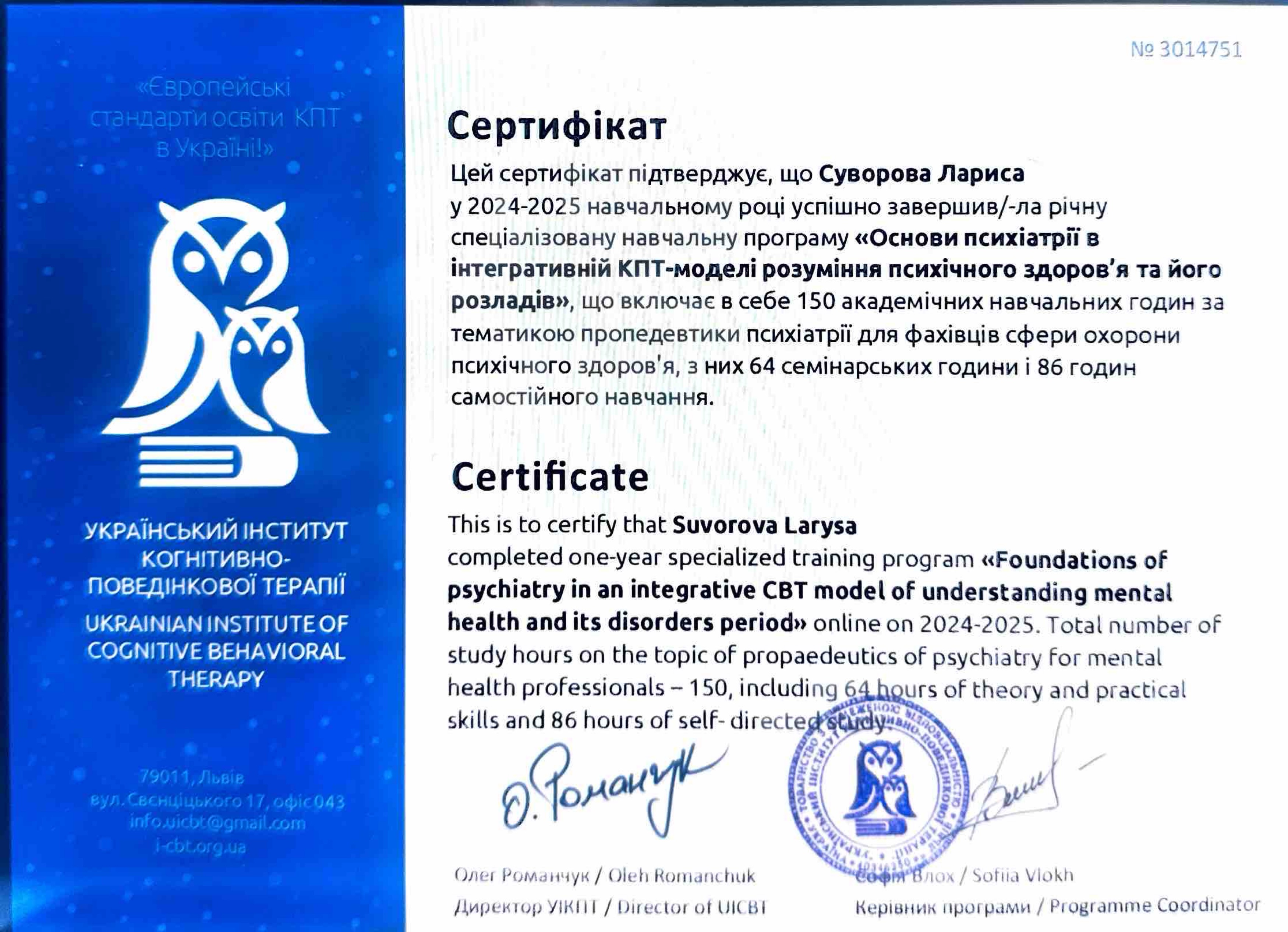 Сертифікат спеціалізована навчальна програма "Основи психіатрії в інтегративній КПТ - моделі розуміння психічного здоров я та його розладів" з 2025 року