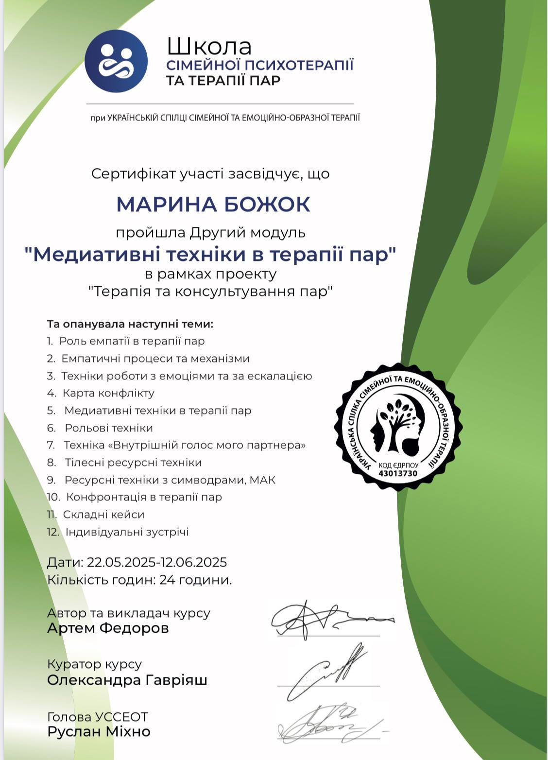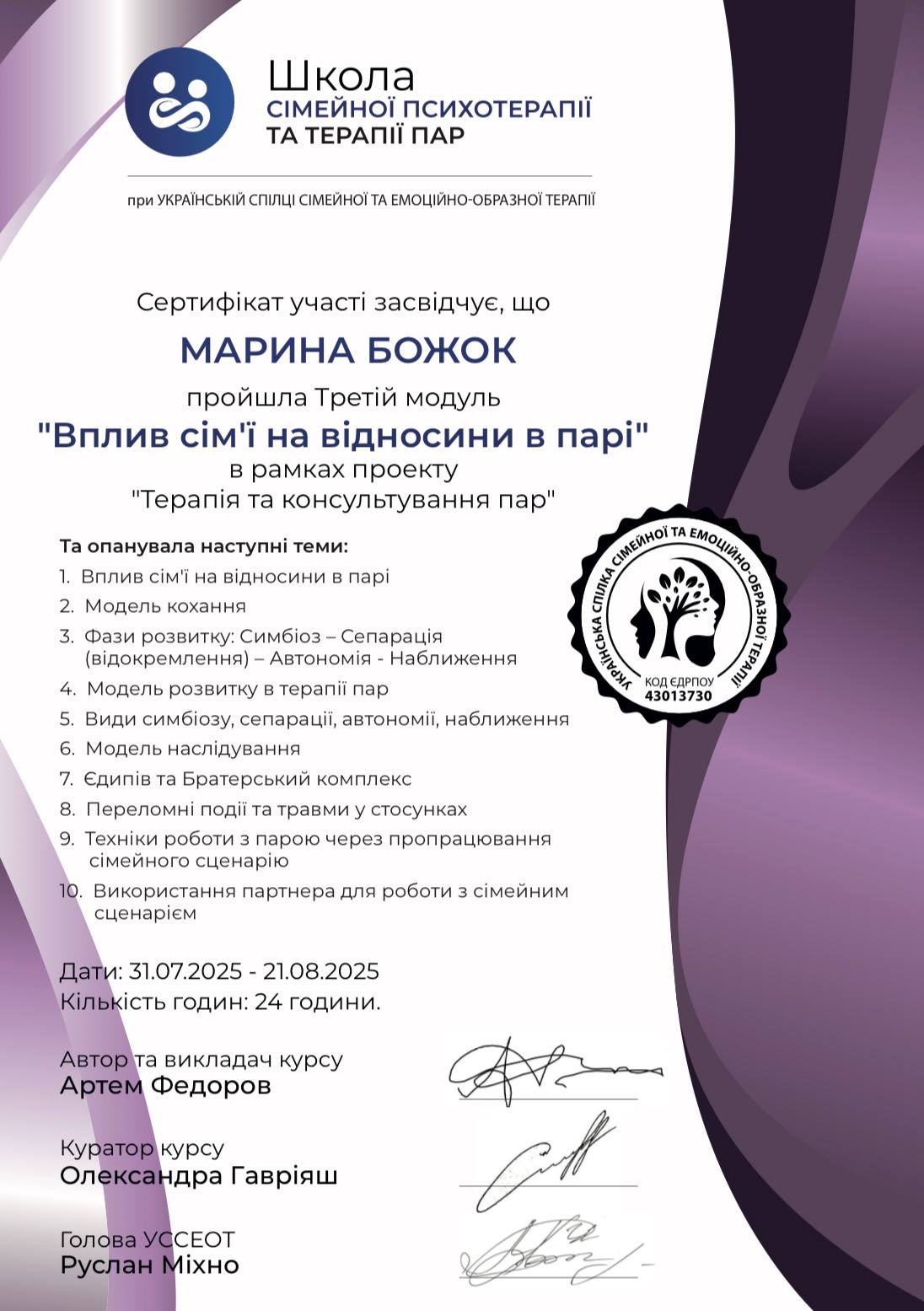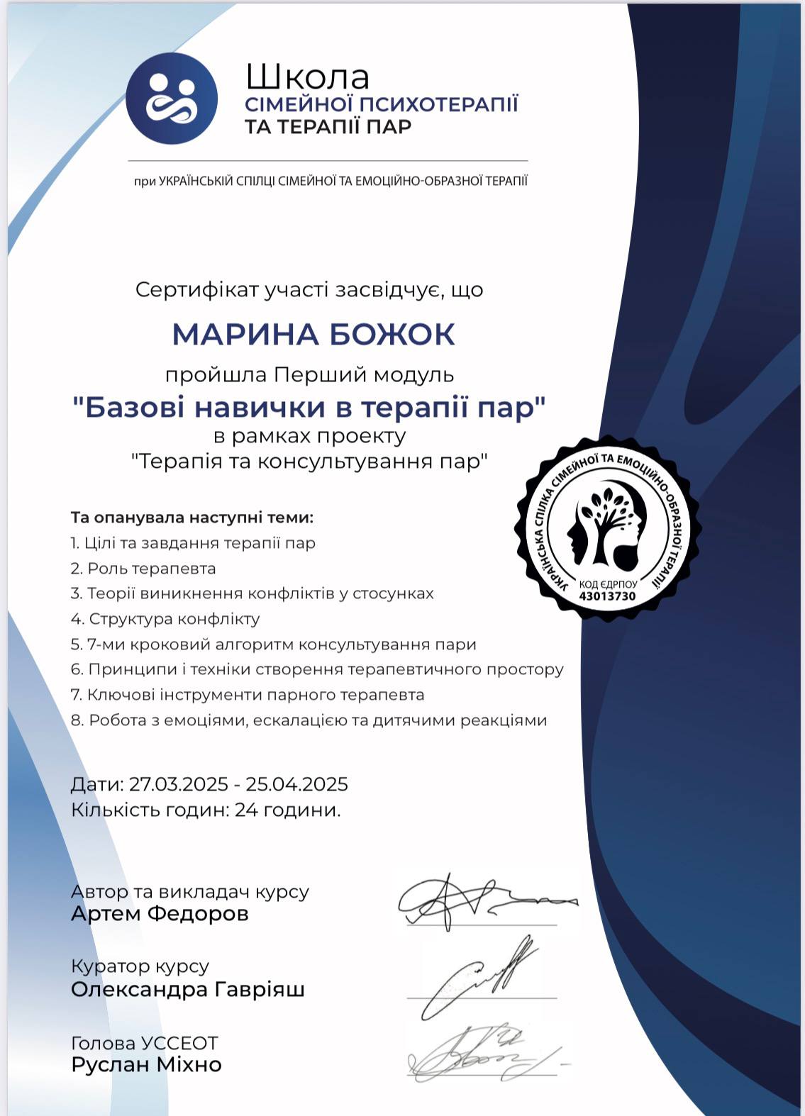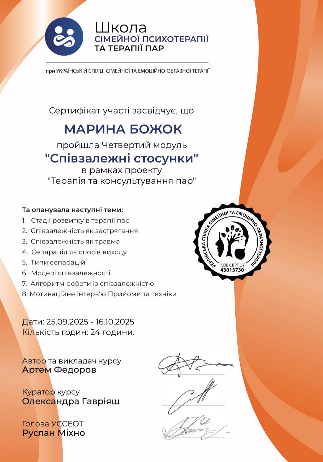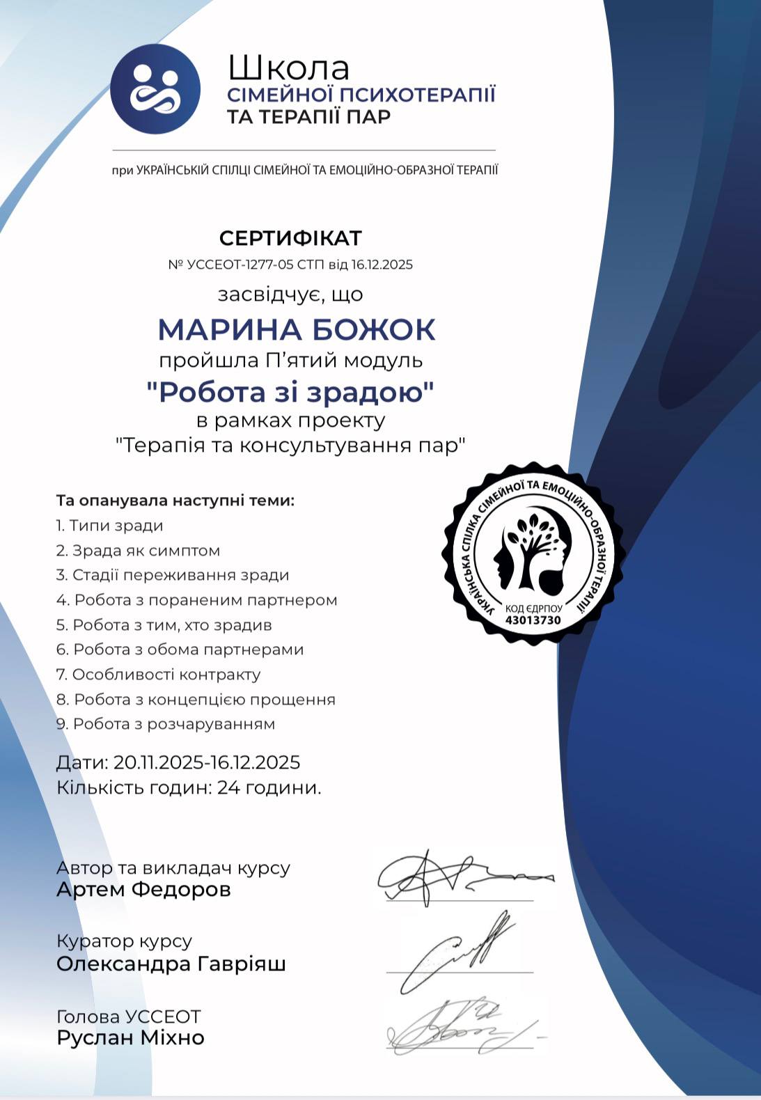 - Сертифікат Терапія та консультування пар з 2025 року