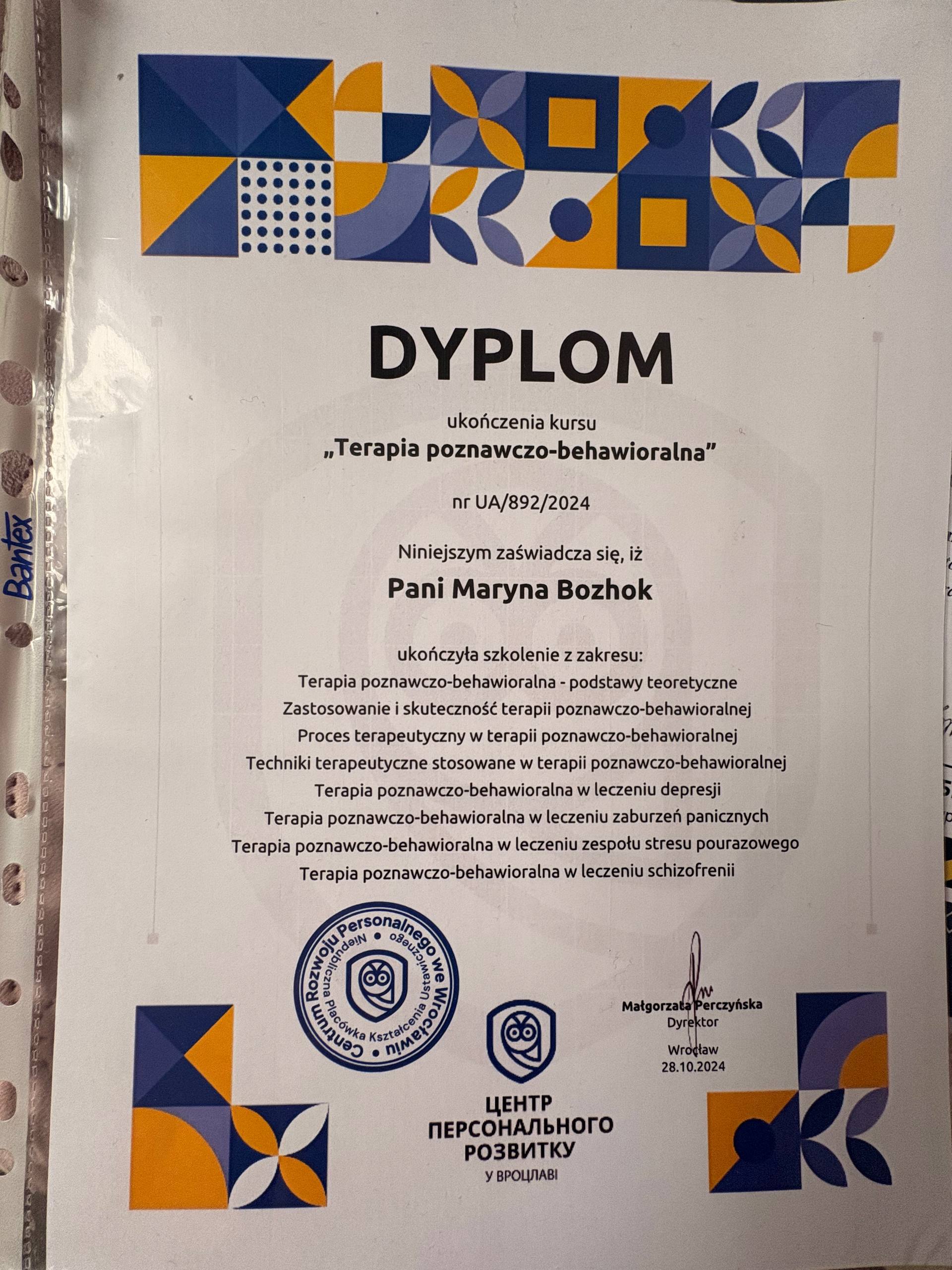 Вітаю, мене звати Марина, я магістр Практичної психології та маю підтверджений диплом в Польщі, згідно польського законодавства.