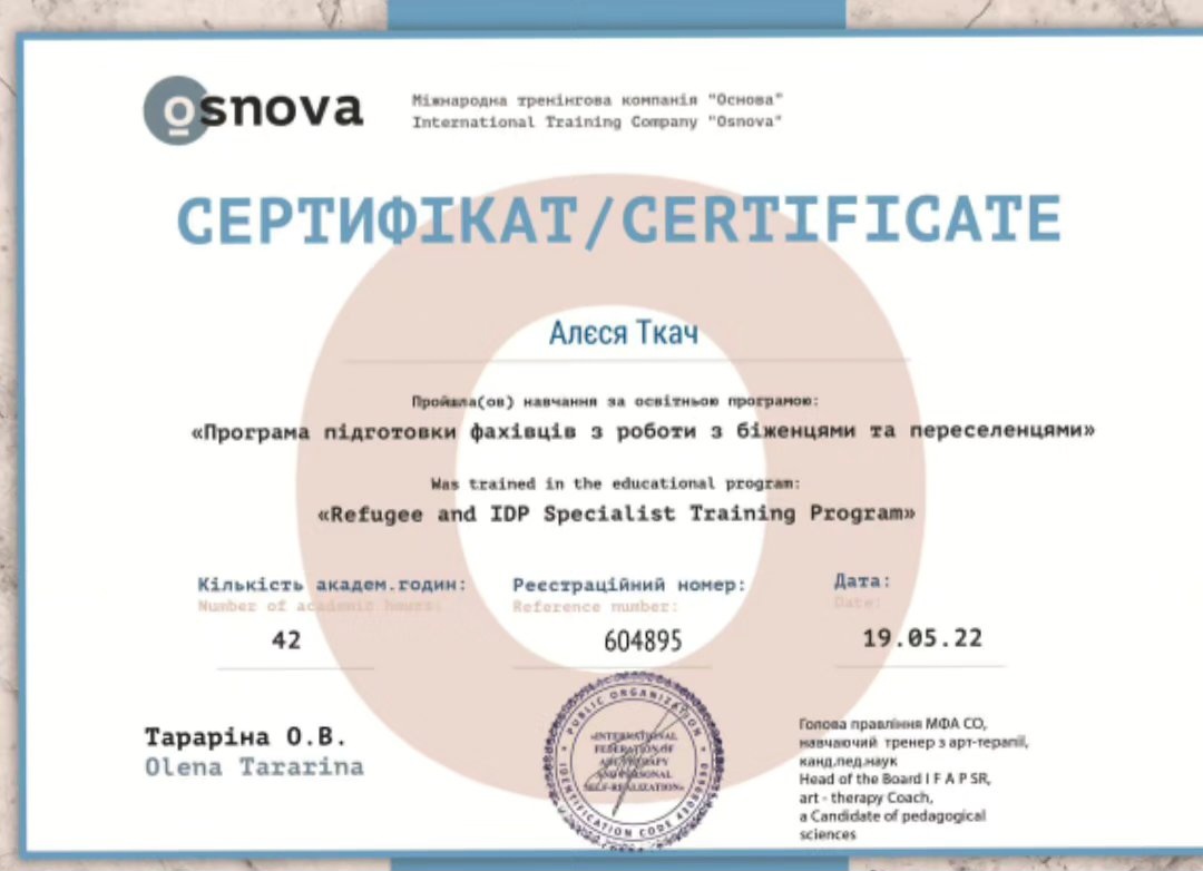 - Сертифікат Програма підготовки фахівців з роботи з біженцями та переселенцями з 2022 року