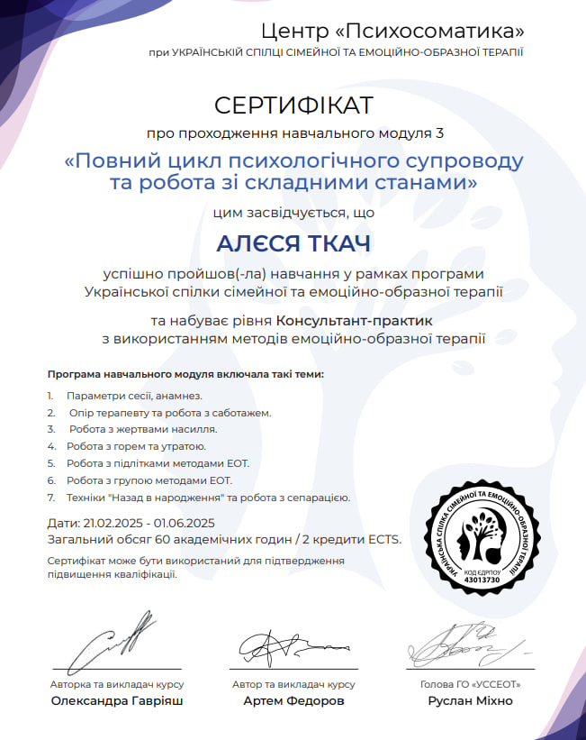 - Сертифікат Консультант-практик з використання методів емоційно-образної терапії з 2025 року