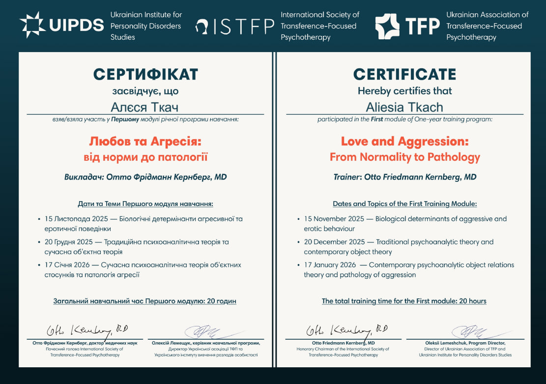 - Сертифікат Любов та агресі: від норми до патології (викладач Отто Кернберґ, модуль 1) з 2026 року