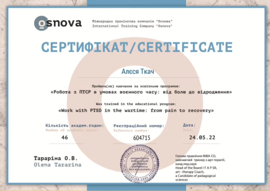 - Сертифікат Робота з ПТСР в умовах воєнного часу: від болю до відродження з 2022 року