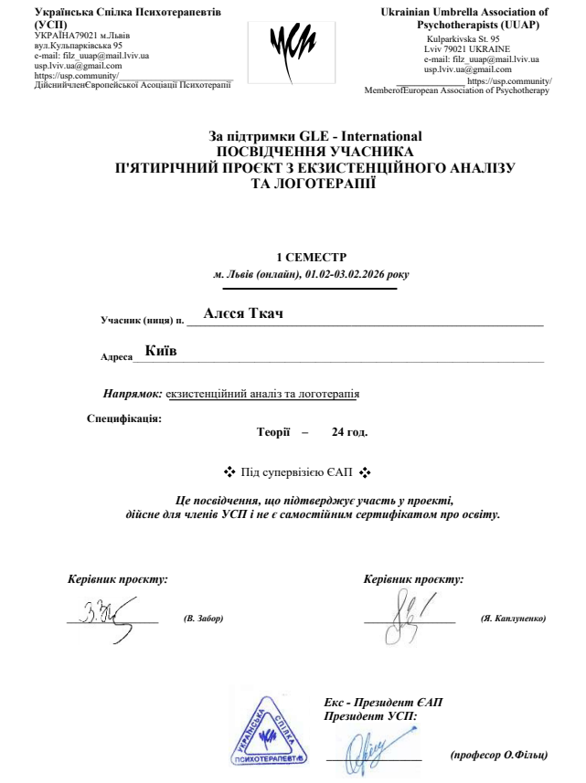 - Сертифікат Посвідчення учасника 5річної програми з Екзистенційного аналізу та логотерапії з 2026 року
