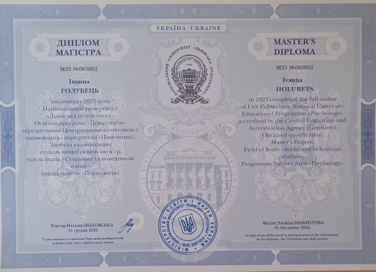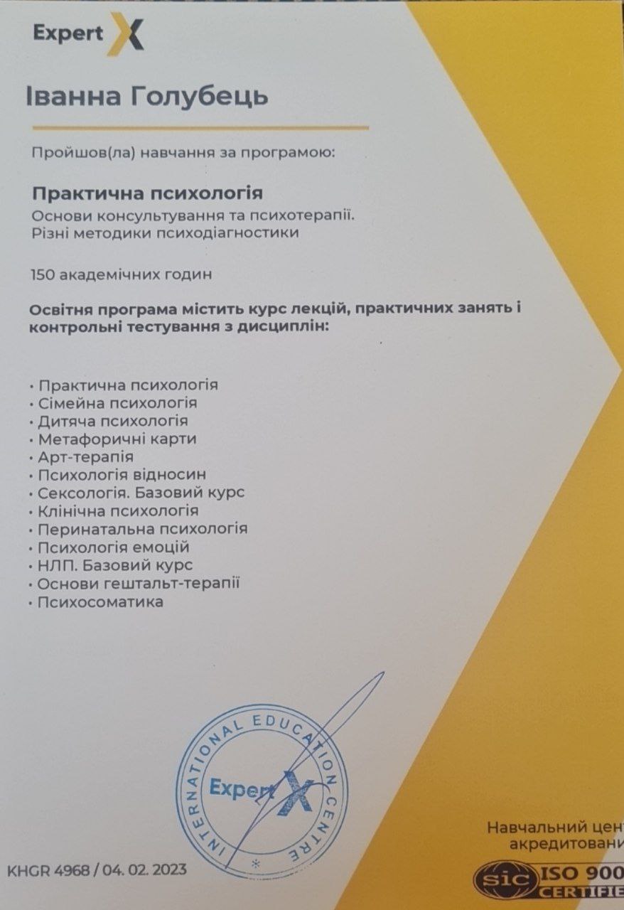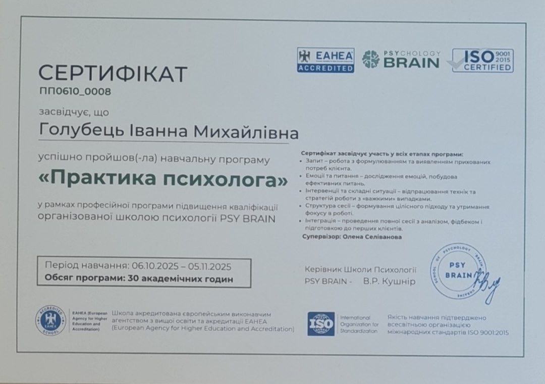 - Сертифікат “Практика психолога” Psy Brain School (30 ак.год) з 2025 року
