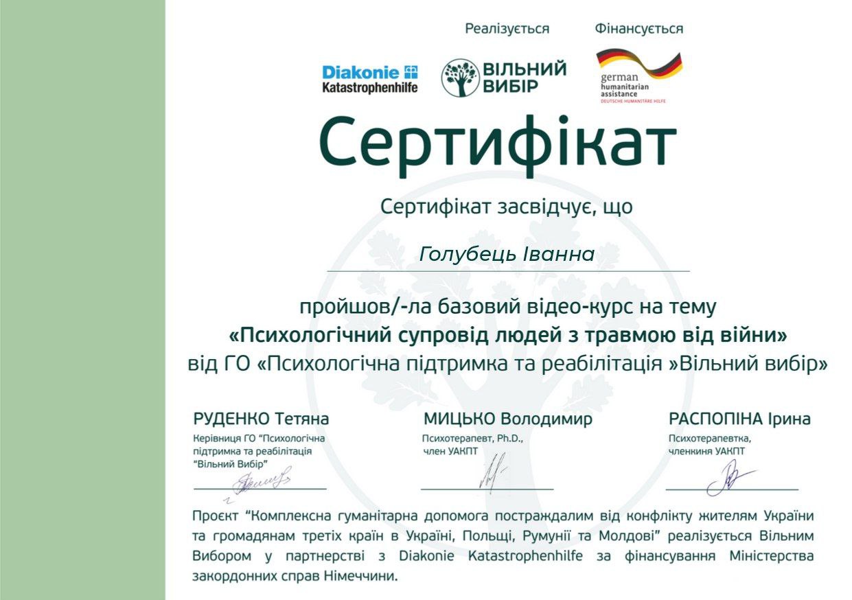 - Сертифікат “Психологічний супровід людей з травмою від війни” ГО”Вільний вибір” з 2025 року