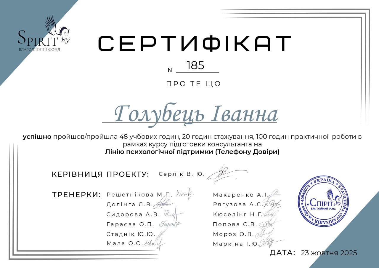 - Сертифікат в рамках курсу підготовки консультанта на Лінію психологічної підтримки (Телефон довіри) (48 учбових годин, 20 год стажування, 100 год практ роботи) БФ “SPIRIT” з 2025 року