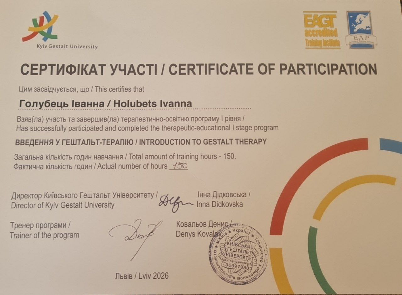- Сертифікат участі “Введення у гештальт-терапію” КГУ ,150 год з 2026 року