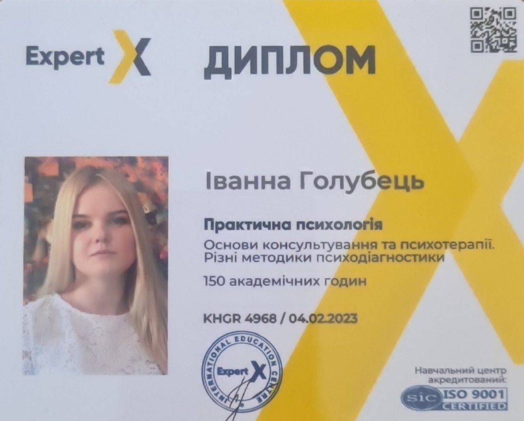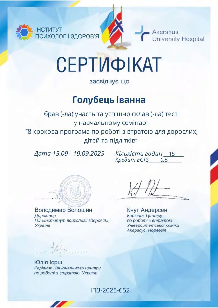 - Сертифікат “8 крокова програма по роботі з втратою для дорослих, дітей та підлітків” Інститут Психології Здоров”я (15 ак.год) з 2025 року
