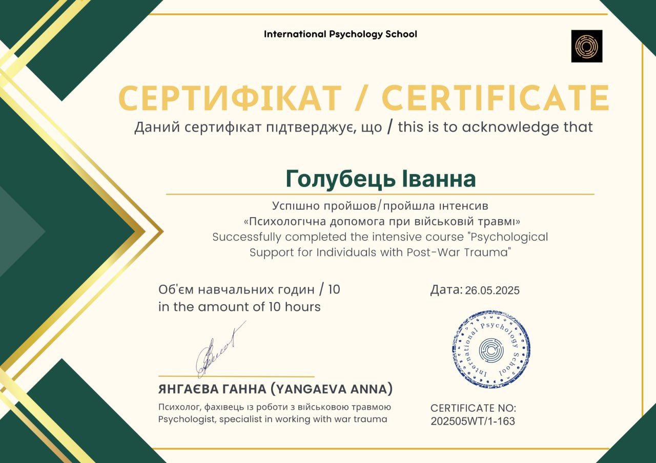 - Сертифікат “Психологічна допомога при військовій травмі” (10 годин) з 2025 року