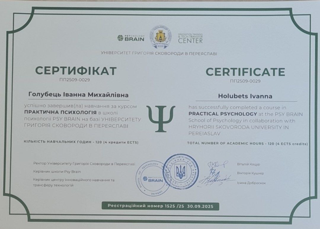 - Сертифікат “Практична психологія” Psy Brain School (120 ак.год) з 2025 року