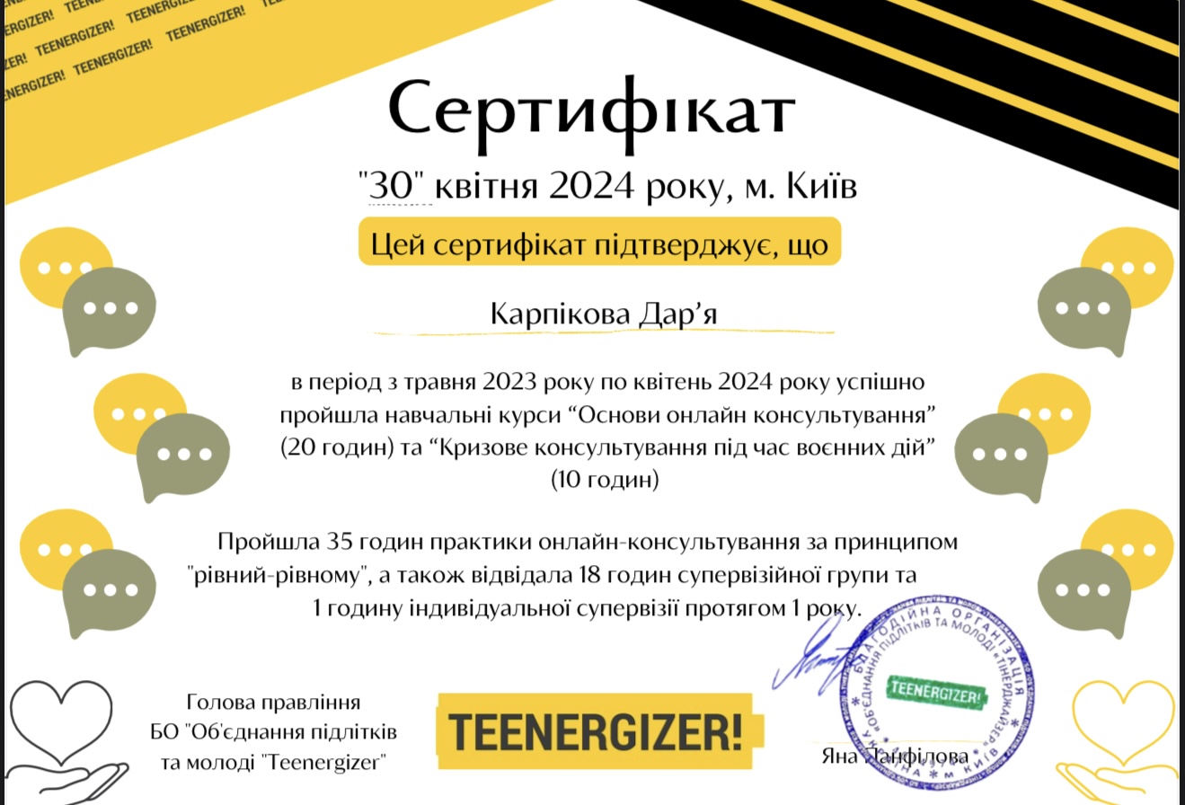 - Сертифікат Сертифікат Teenergizer з 2024 року