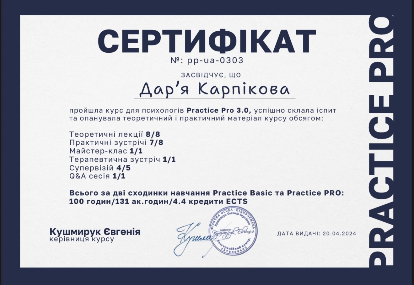 Мені важливо створити безпечний простір, де можна відкрито обговорити переживання та знайти ефективні шляхи вирішення проблем. Я використовую сучасні психологічні технології та підходи, адаптуючи їх під індивідуальні потреби кожної людини, і завжди прагну до точності, глибини та результативності своєї роботи.