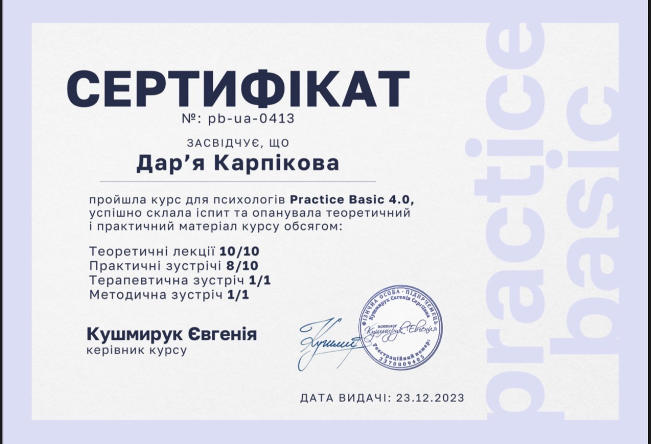Я - психолог, який прагне допомагати людям знаходити внутрішню рівновагу та ресурс для життя. Мій підхід поєднує емпатію, уважне слухання та практичні методики, щоб кожна консультація була не лише корисною, а й комфортною для клієнта.
