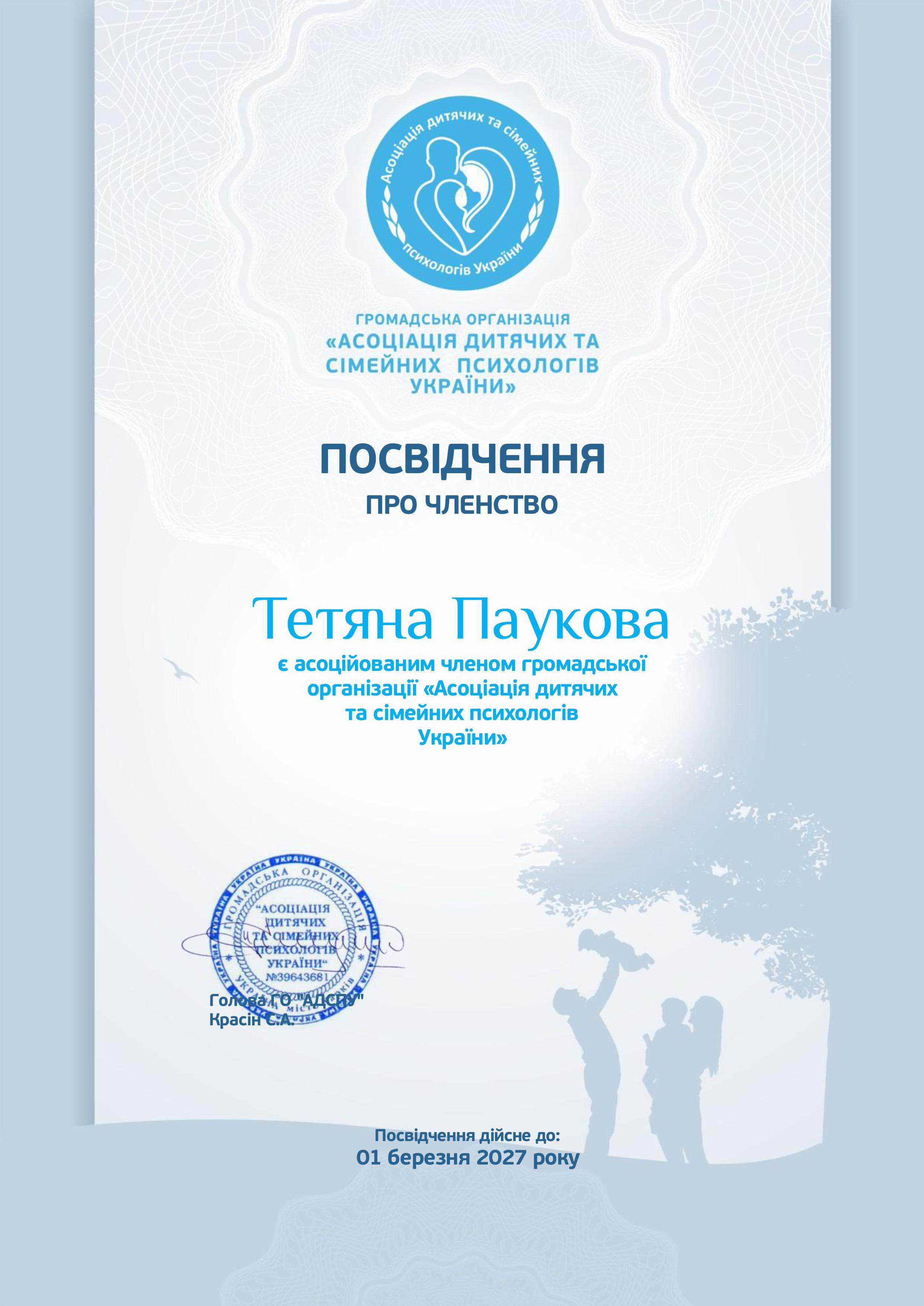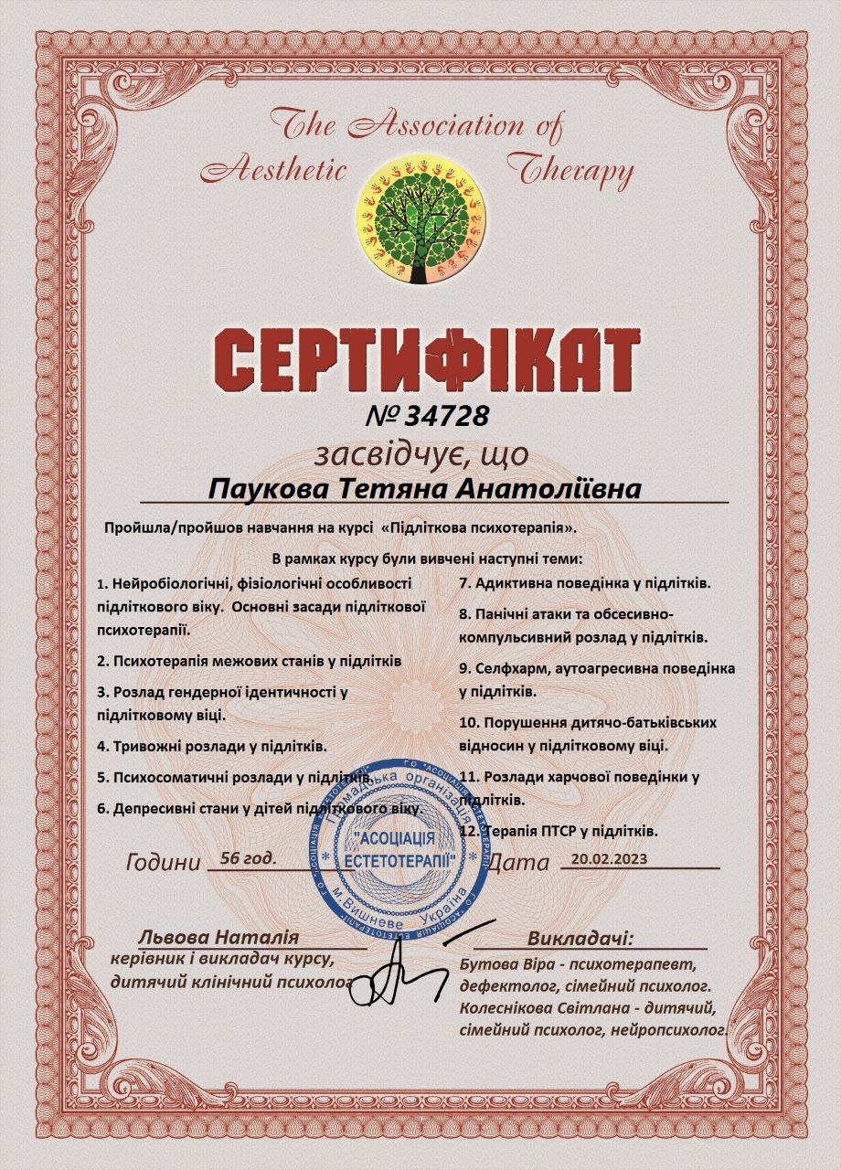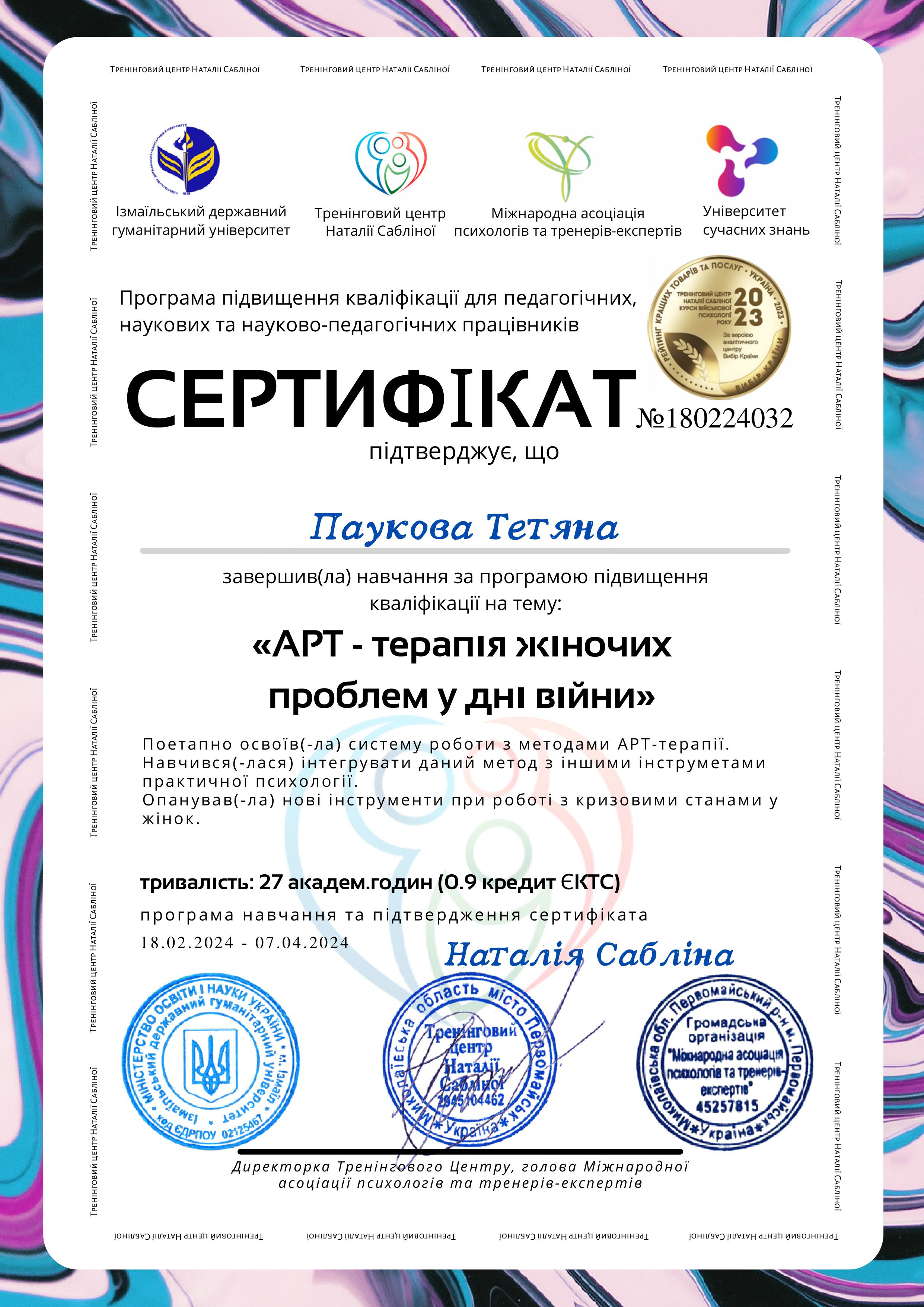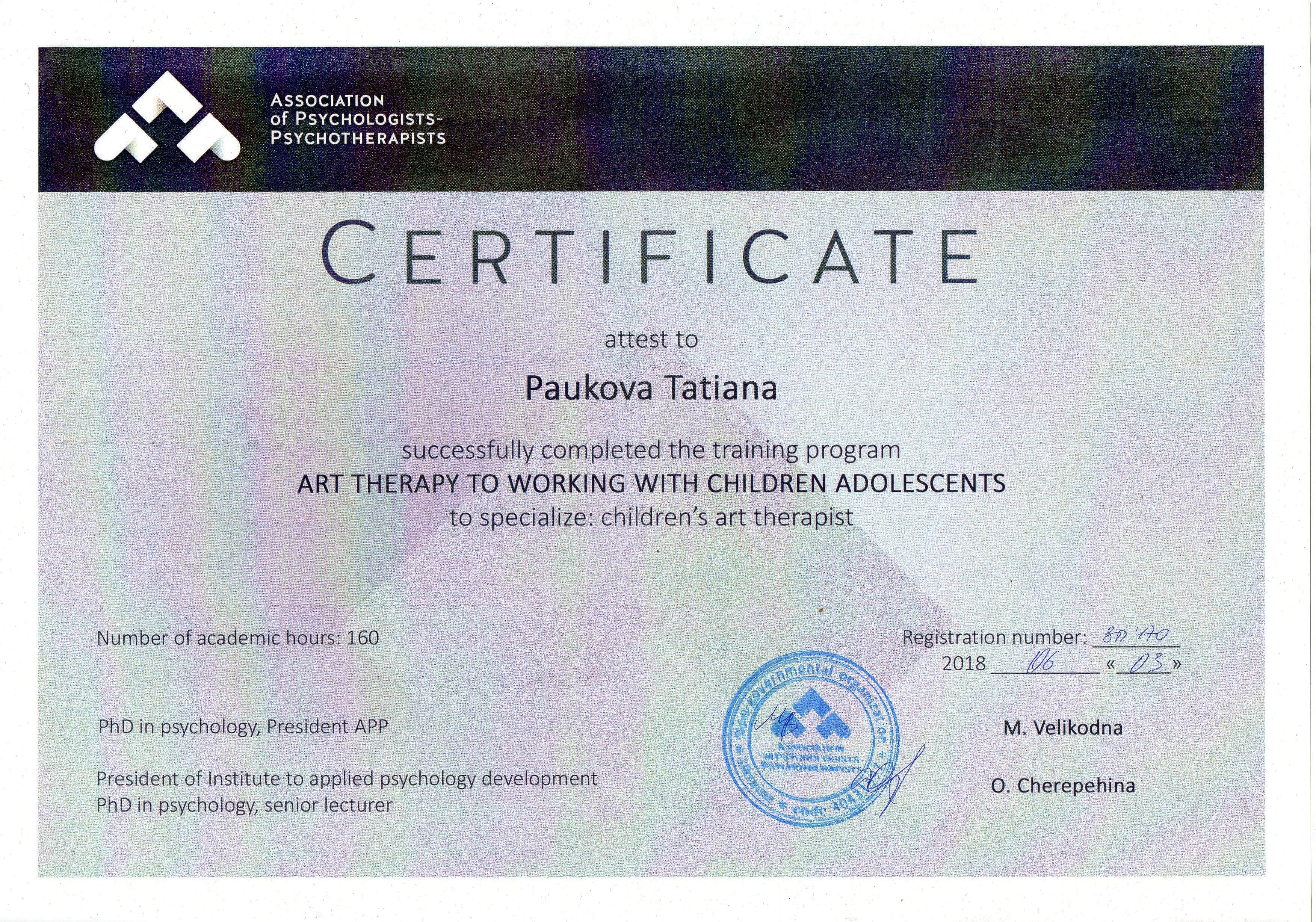- Сертифікат ASSOCIATION of PSYCHOLOGISTS-PSYCHOTHERAPISTS ART THERAPY TO WORKING WITH CHILDREN ADOLESCENTS з 2018 року