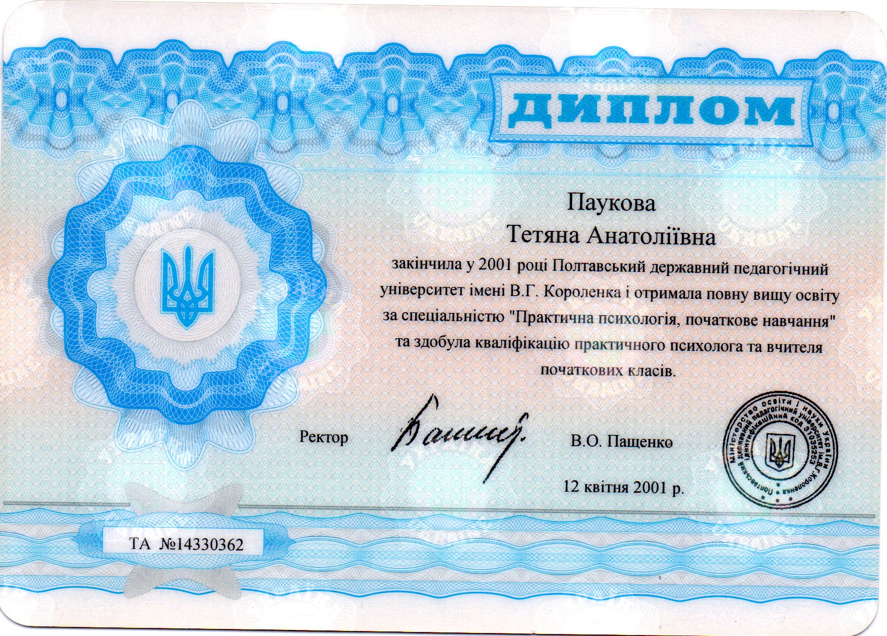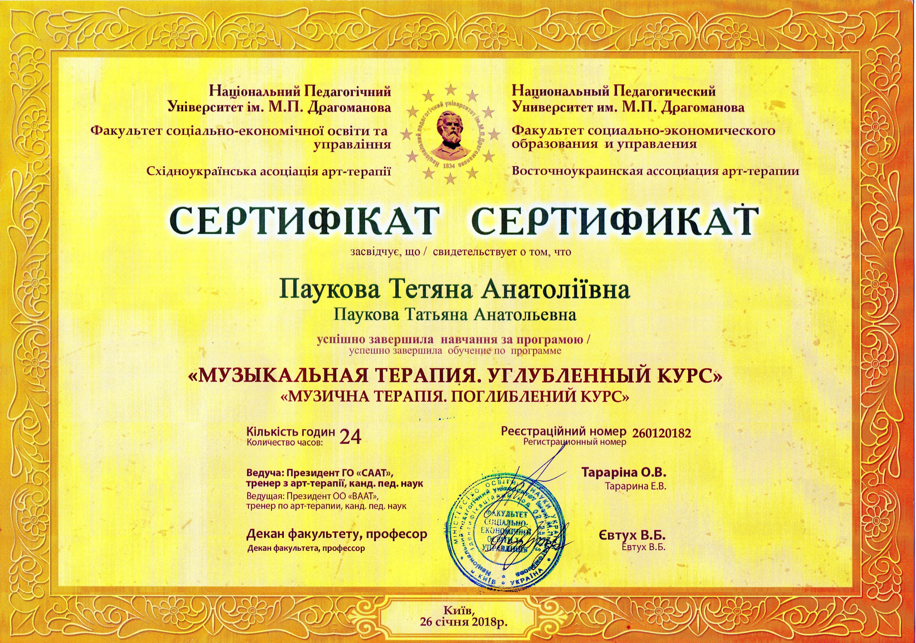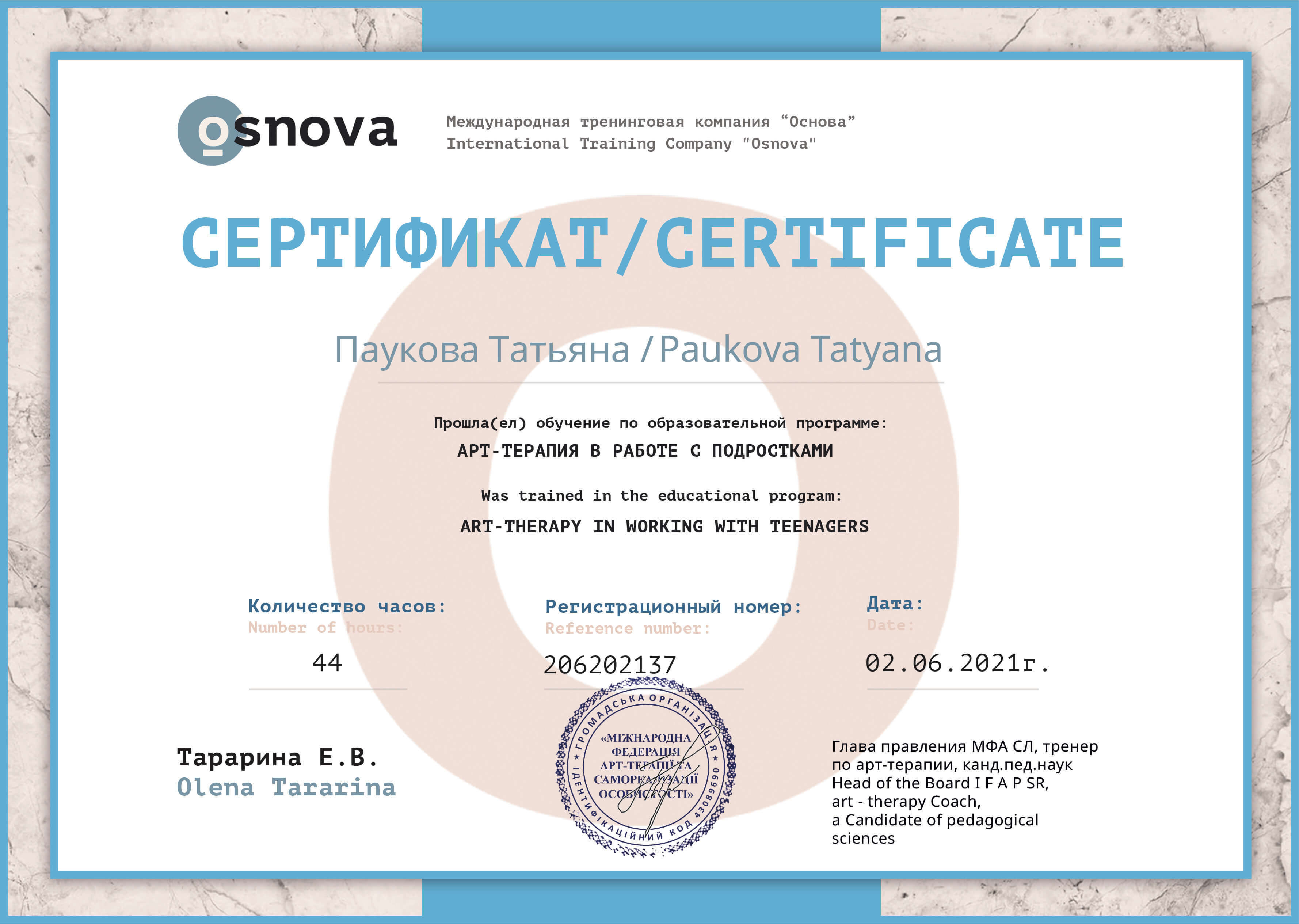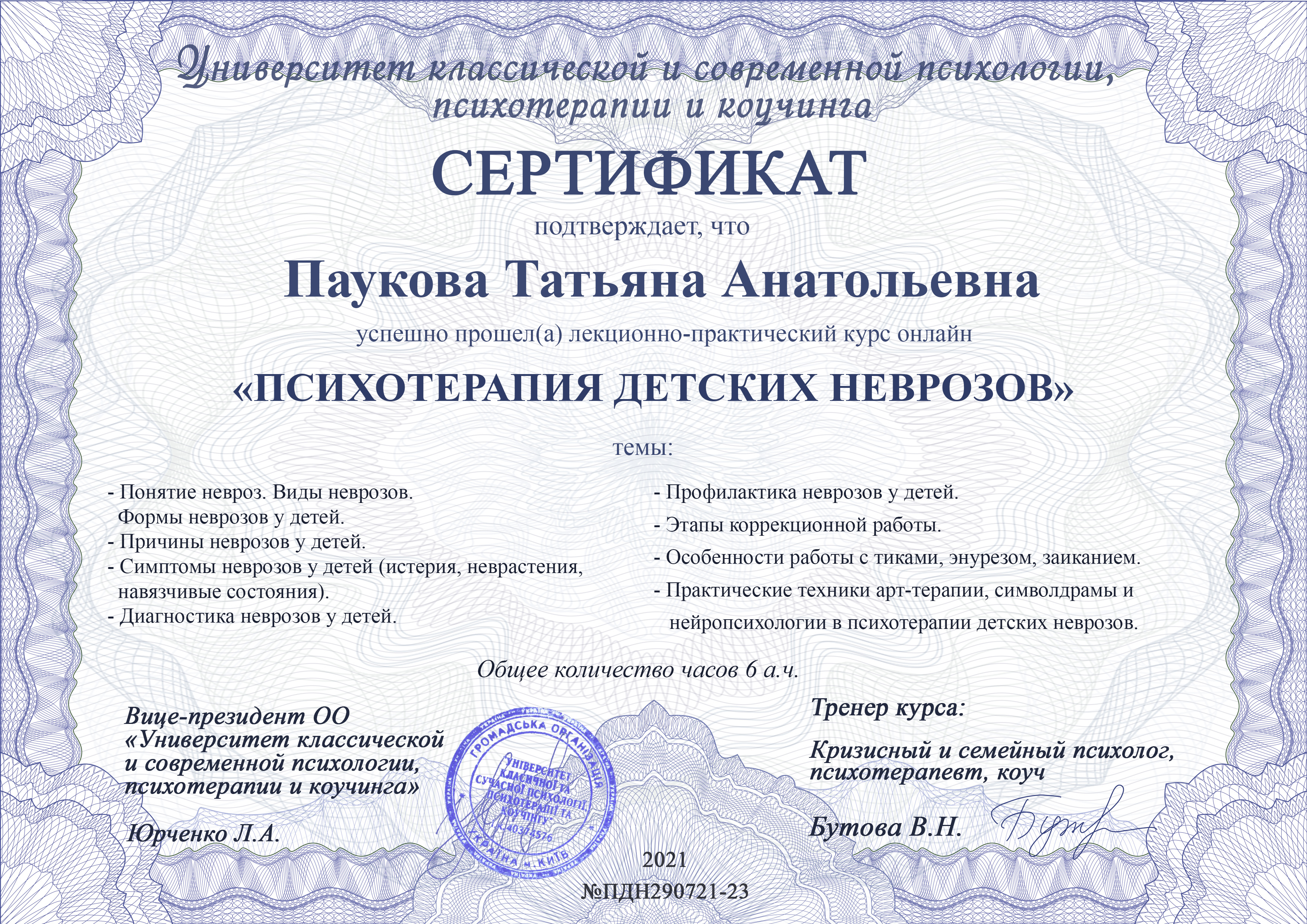 - Сертифікат ASSOCIATION of PSYCHOLOGISTS-PSYCHOTHERAPISTS ART THERAPY TO WORKING WITH CHILDREN ADOLESCENTS з 2018 року