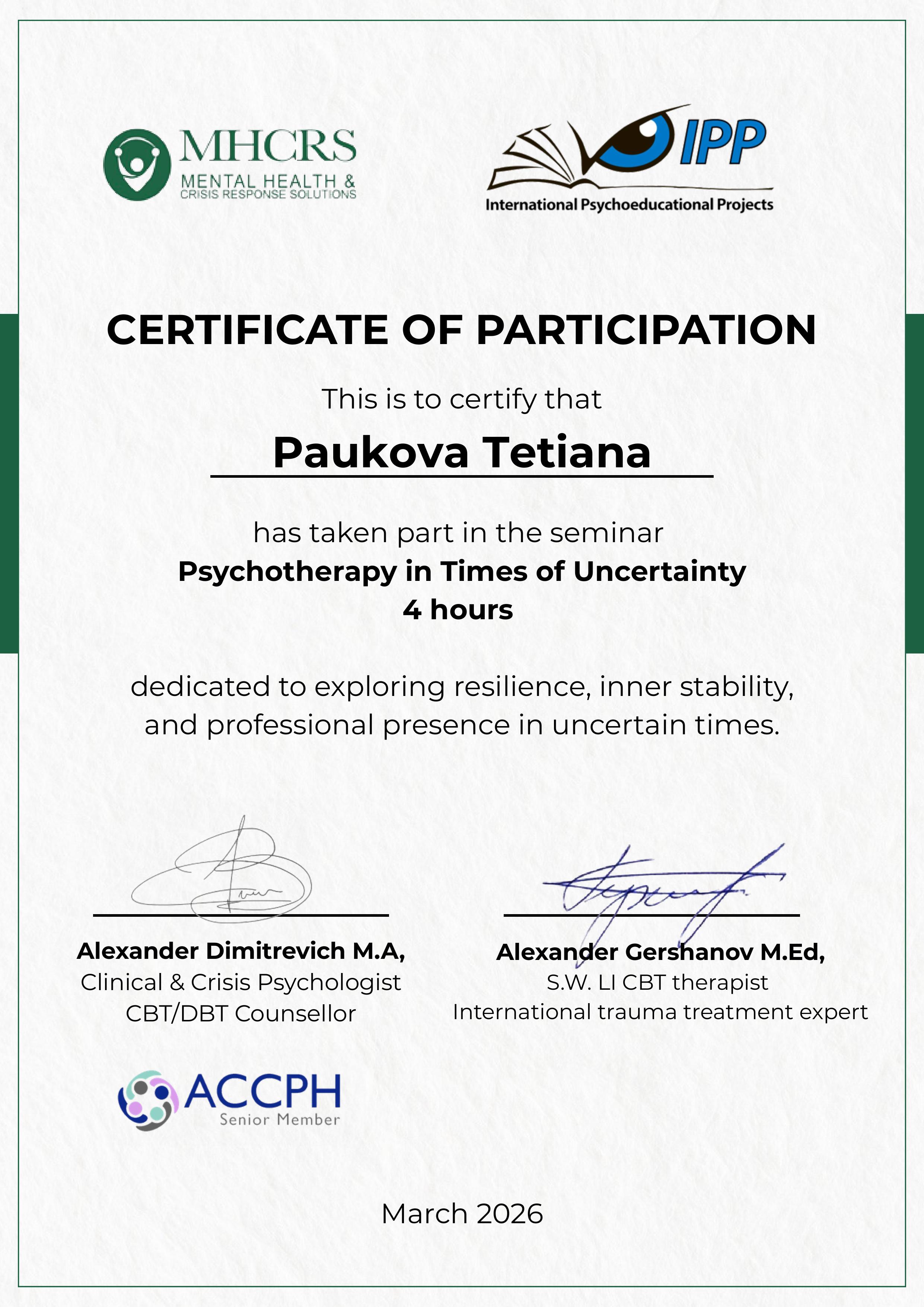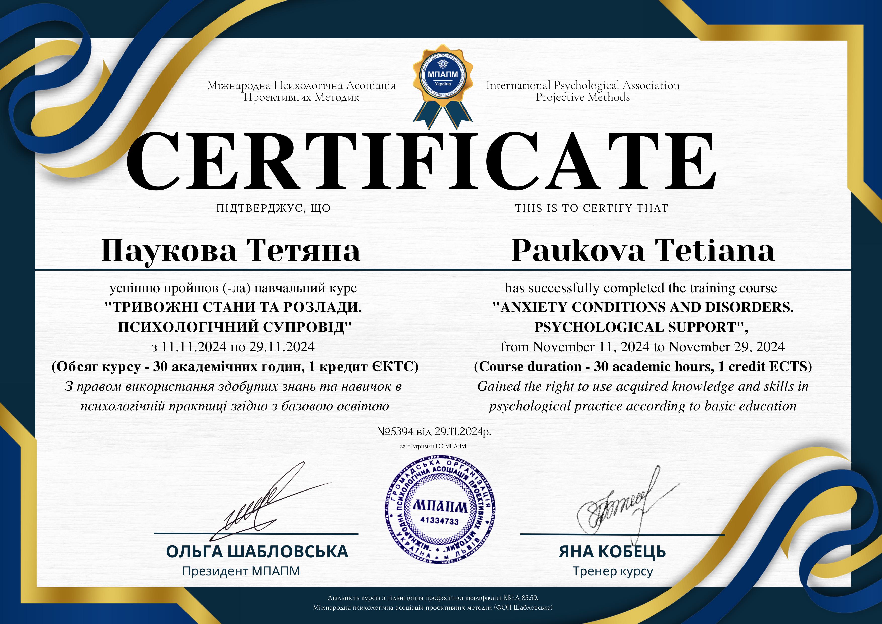 - Сертифікат Міжнародна Психологічна Асоціація ТРИВОЖНІ СТАНИ ТА РОЗЛАДИ. ПСИХОЛОГІЧНИЙ СУПРОВІД з 2024 року