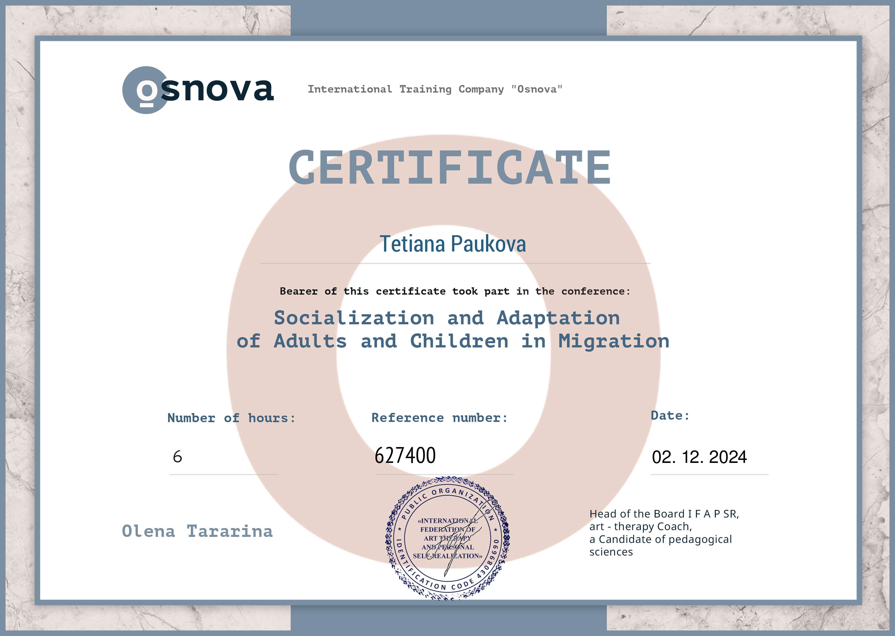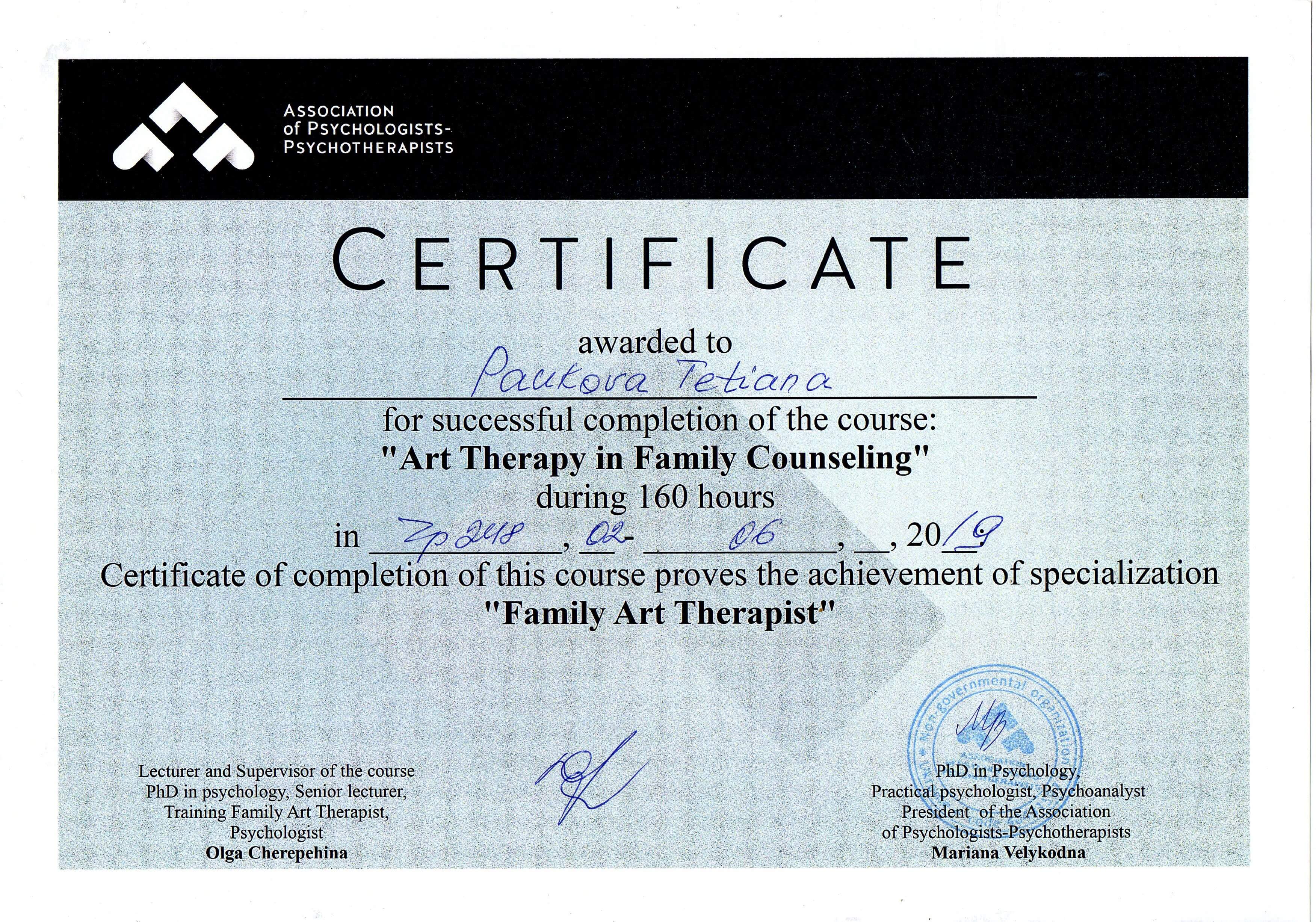 - Сертифікат Association of Psychologists-Psychotherapists Art Therapy in Family Counseling з 2019 року