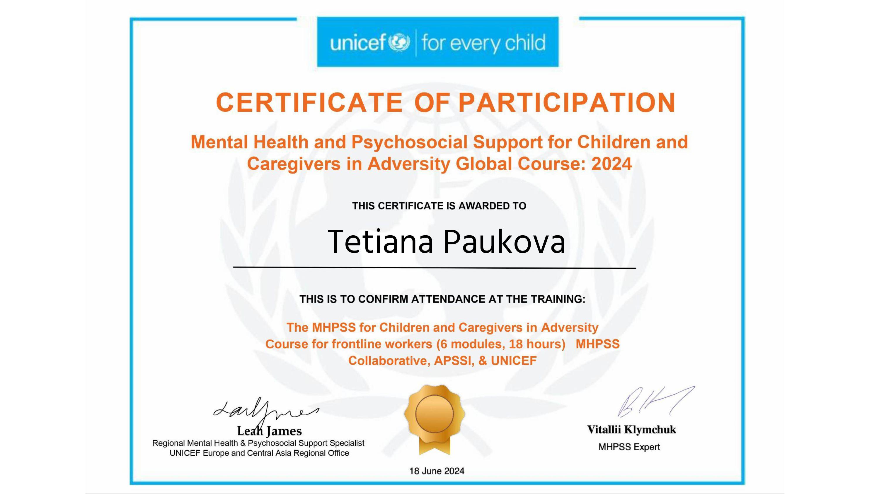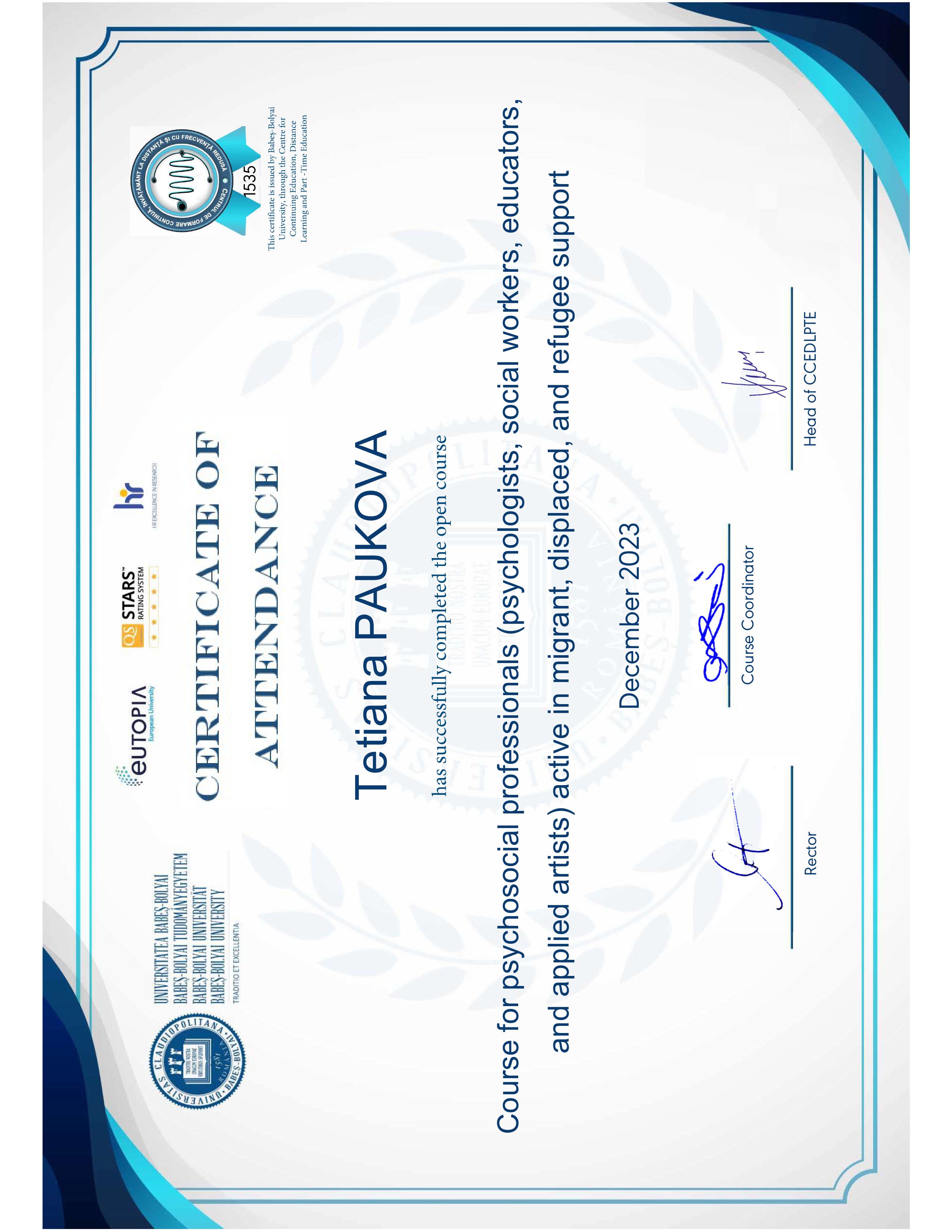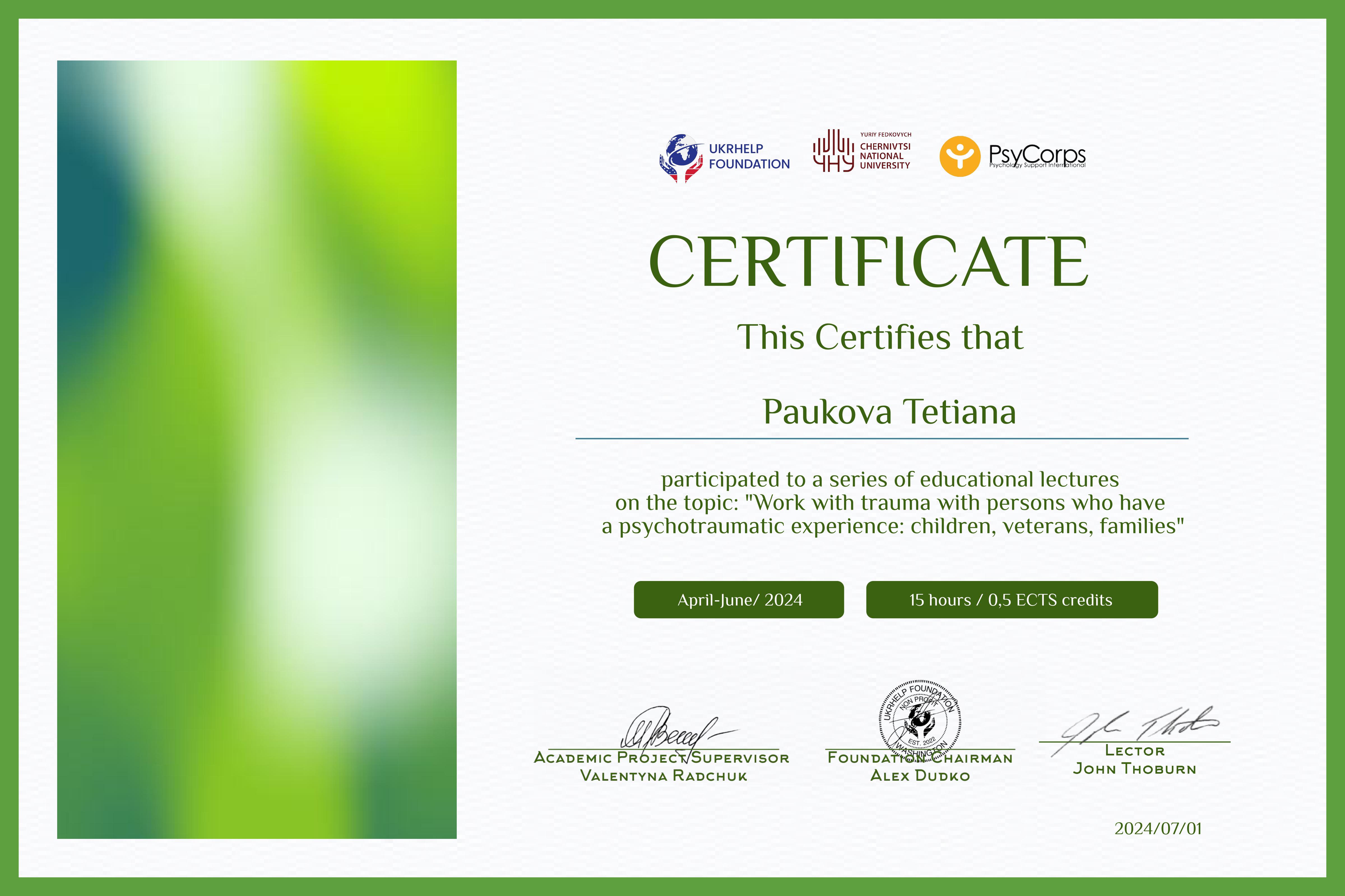 - Сертифікат Work with trauma with persons who have a psychotraumatic experience: children, veterans, families з 2024 року