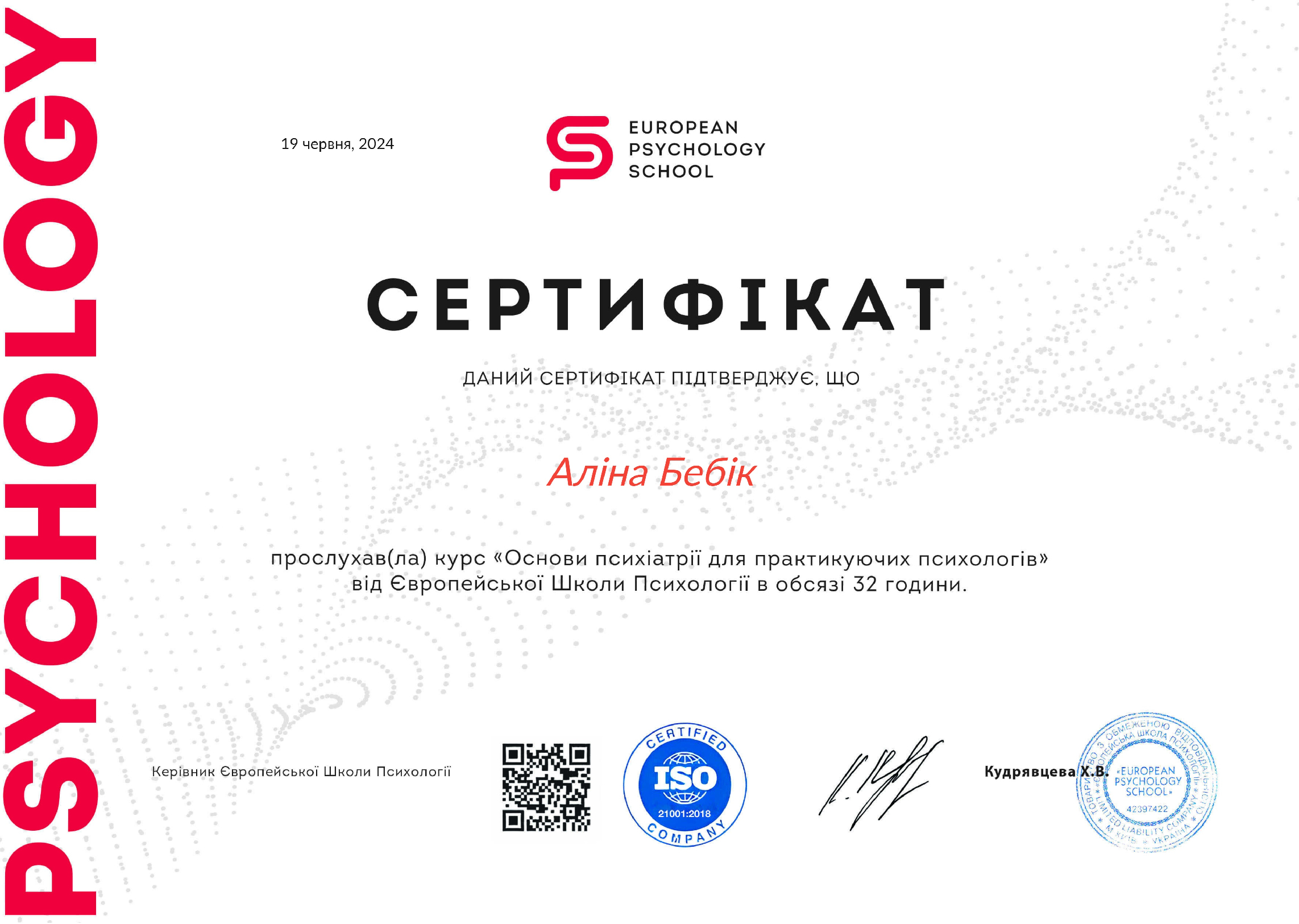 - Сертифікат Європейська школа психології - курс "Основи психіатрії для практикуючих психологів" з 2024 року