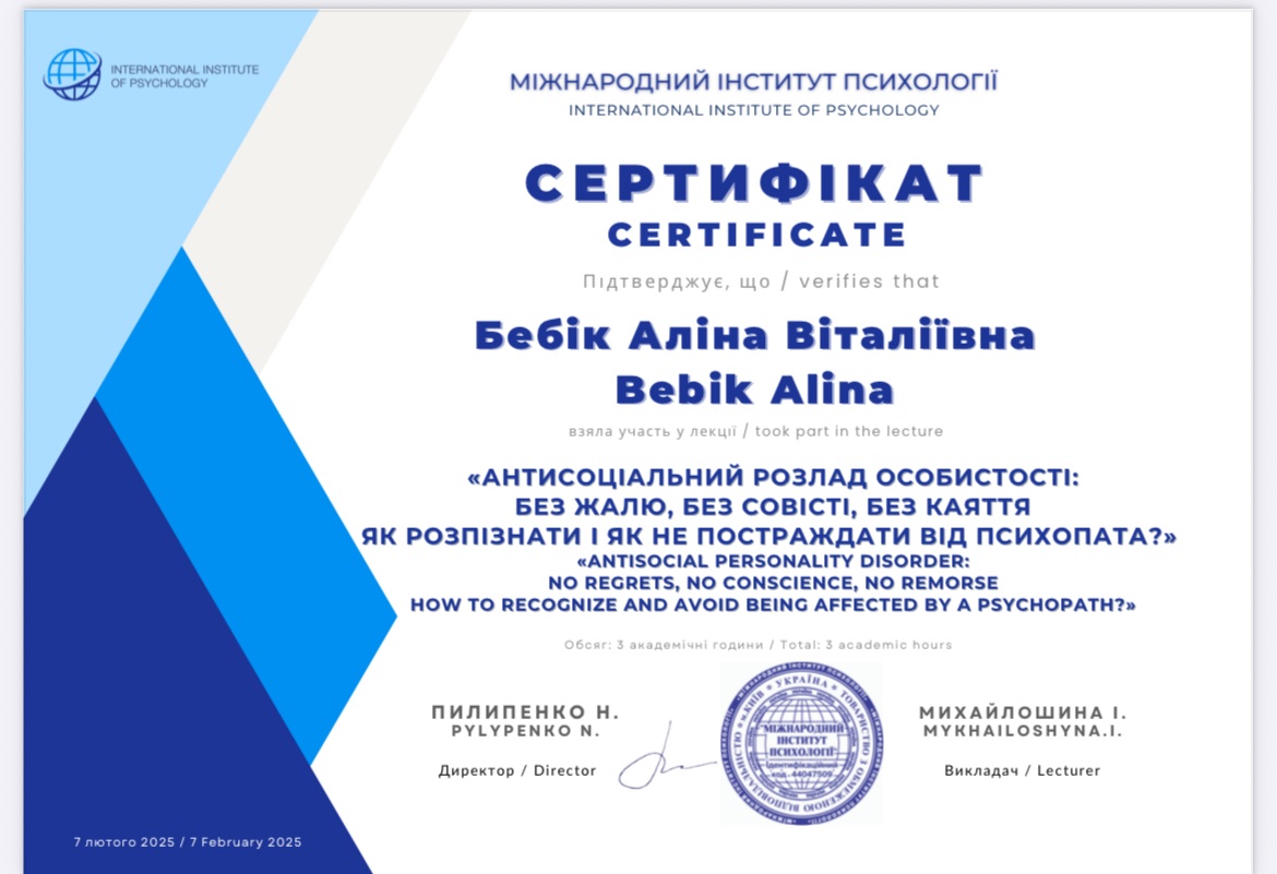 - Сертифікат Міжнародний Інститут Психології - лекція "Антисоціальний розлад особистості: без жалю, без совісті, без каяття. Як розпізнати і як не постраждати від психопата?" з 2025 року
