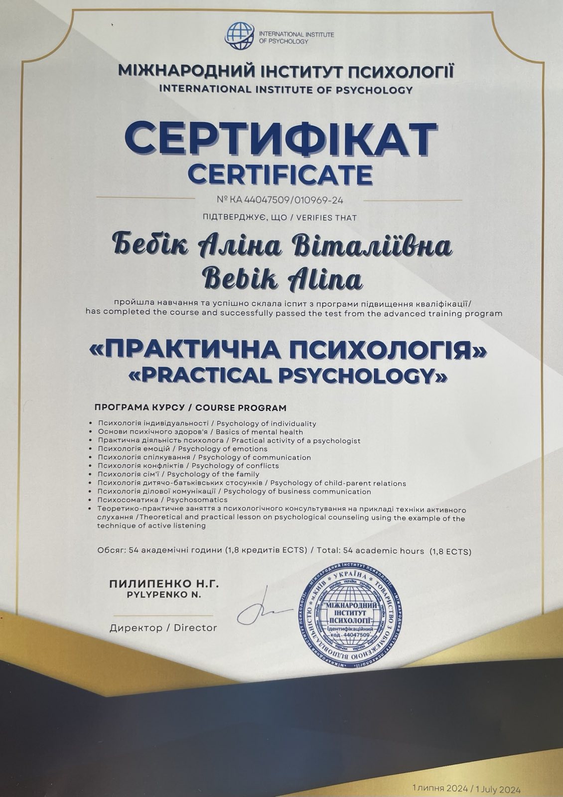- Сертифікат Міжнародний Інститут Психології - курс "Практична психологія" з 2024 року