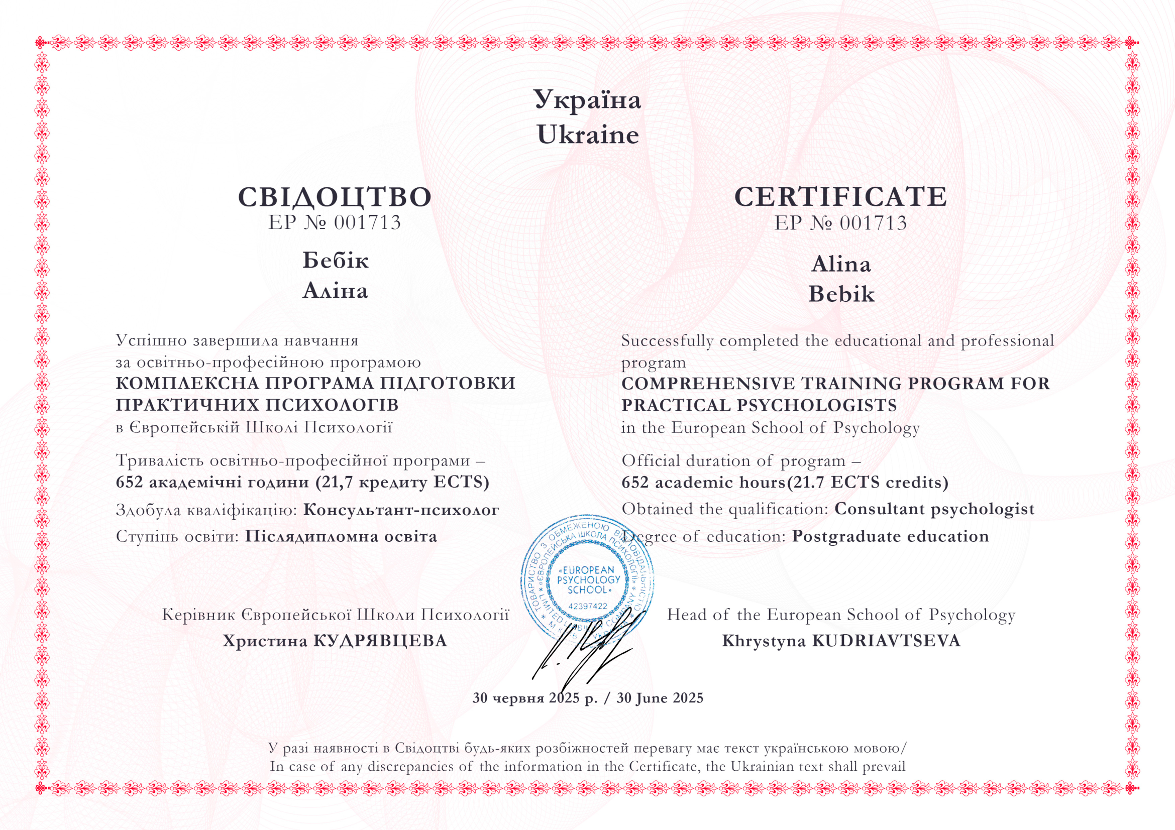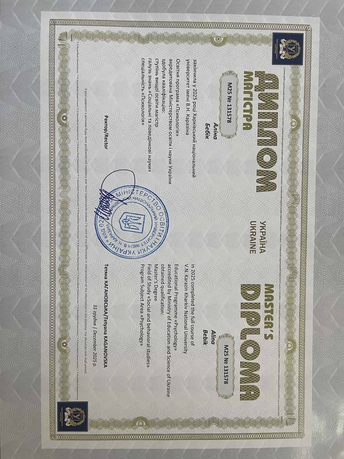 - Сертифікат Європейська школа психології - курс "Комплексна програма підготовки практичних психологів" з 2025 року