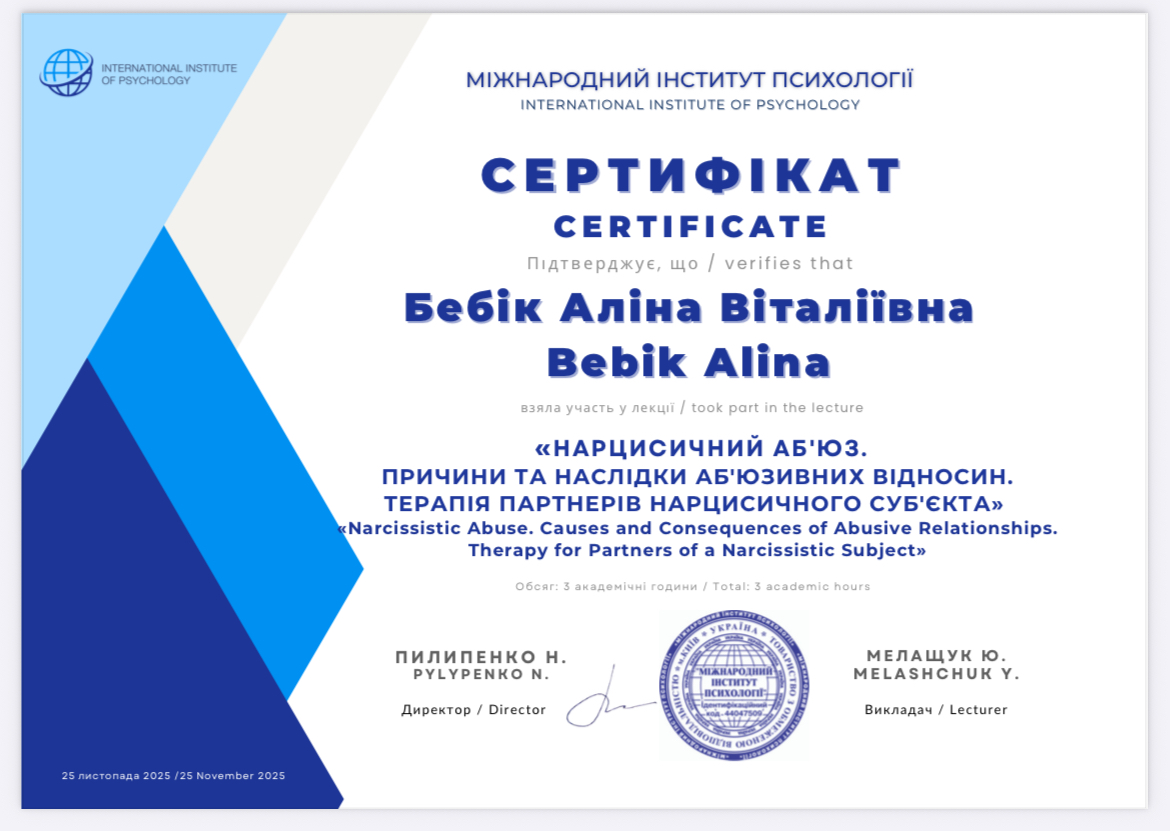 - Сертифікат Міжнародний Інститут Психології - лекція "Нарцисичний аб'юз"" з 2025 року