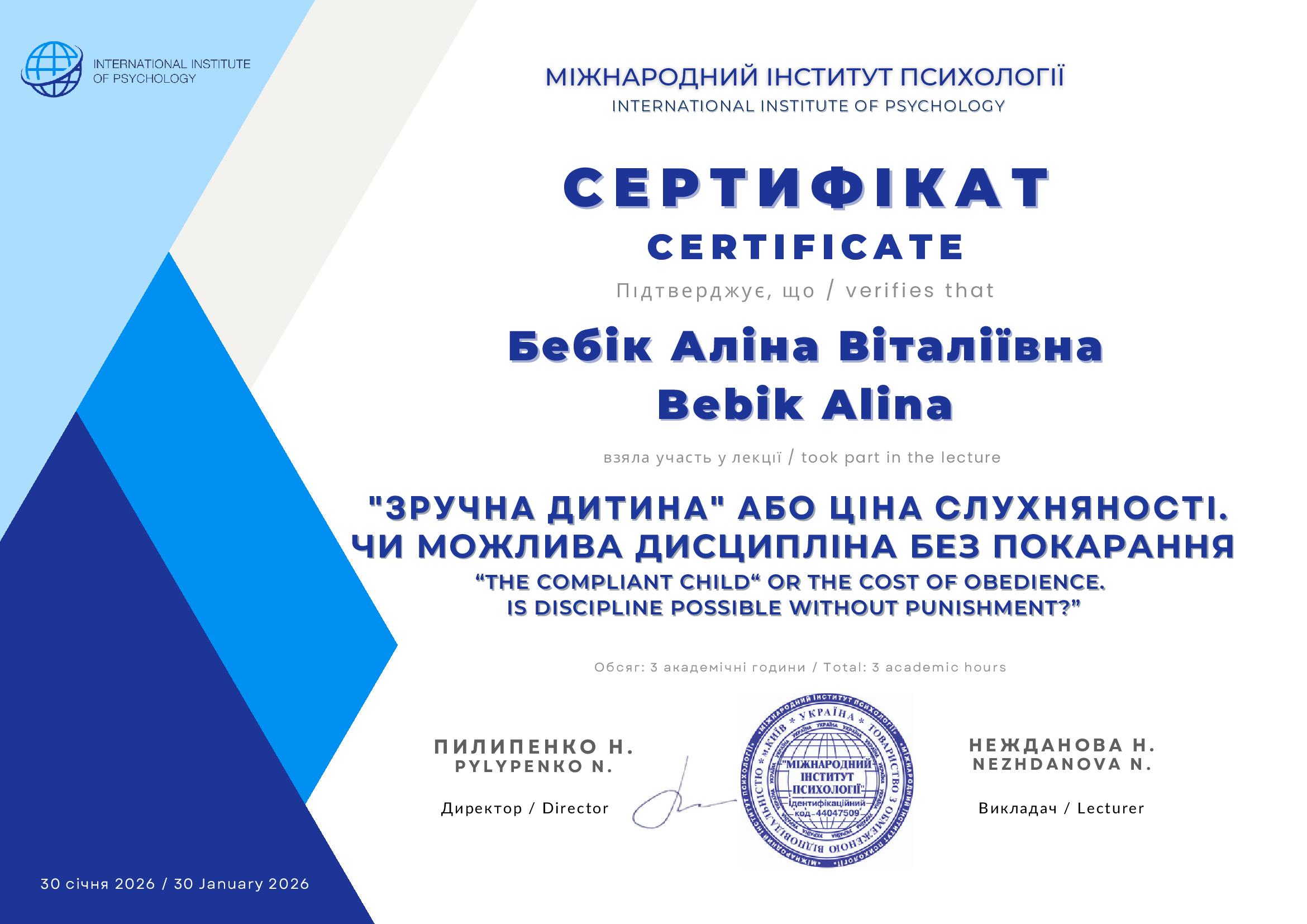 - Сертифікат Міжнародний Інститут Психології - лекція "Зручна дитина або ціна слухняності" з 2026 року