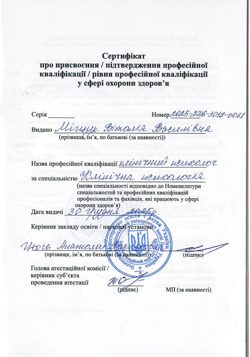 - Сертифікат Кафедра практичної психології та психодіагностики ВНУ імені Лесі Українки - Клінічна психологія з 2025 року