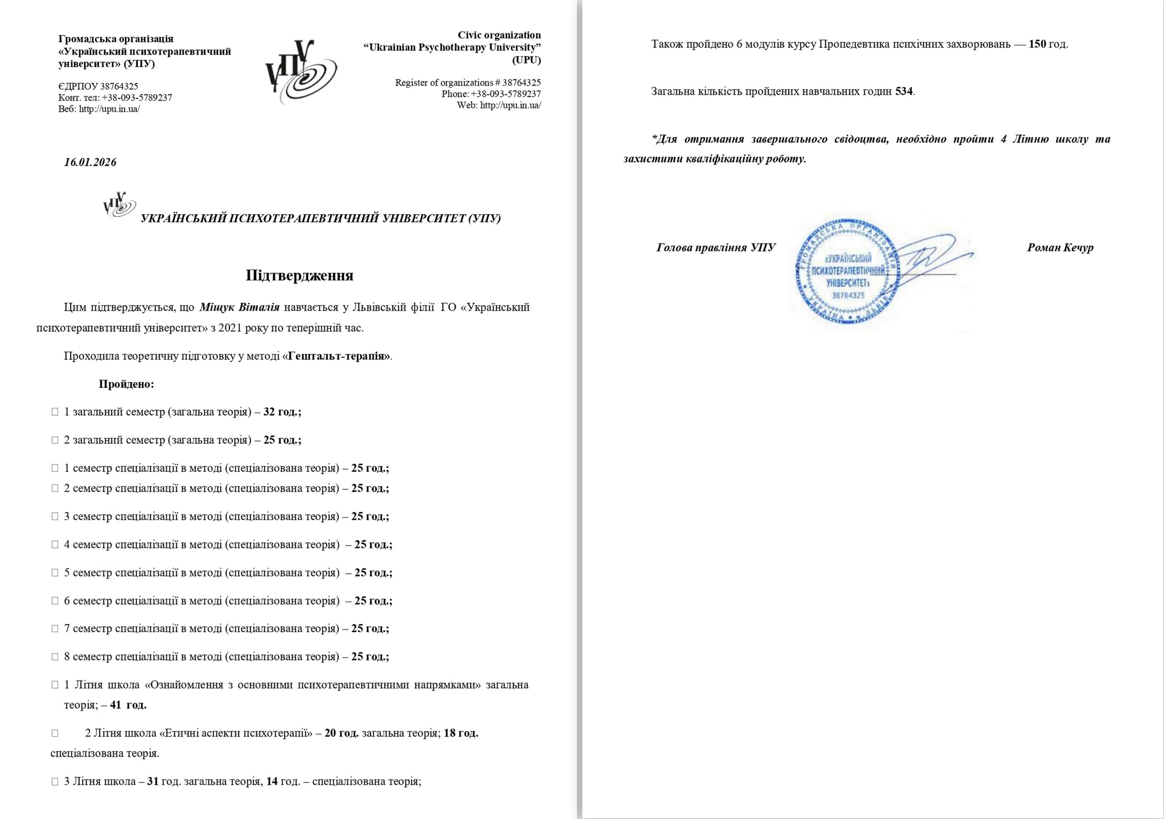 - Сертифікат Український Психотерапевтичний Університет - гештальт терапевт з 2026 року