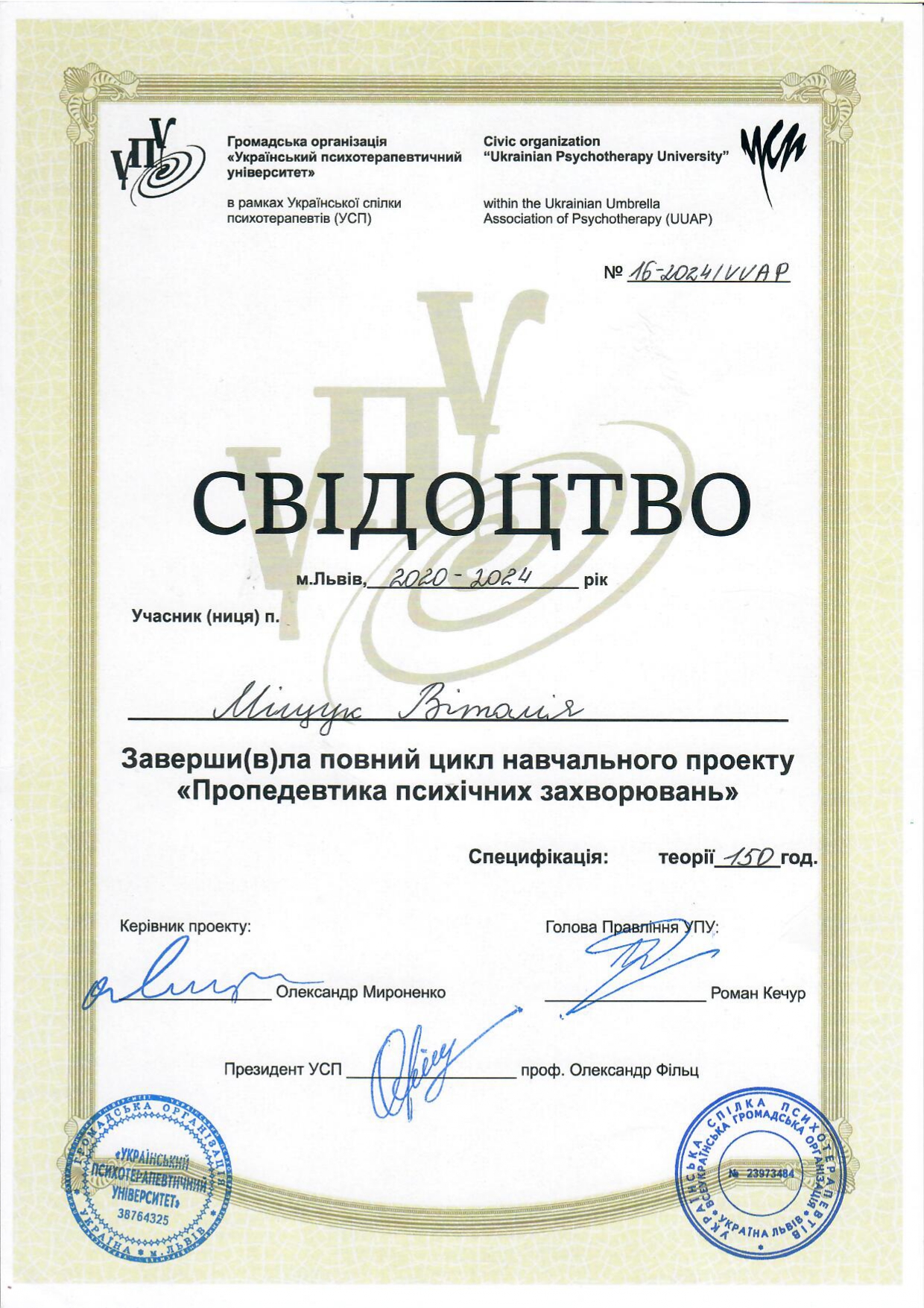 - Сертифікат Український Психотерапевтичний Університет - Пропедевтика психічних захворювань з 2024 року