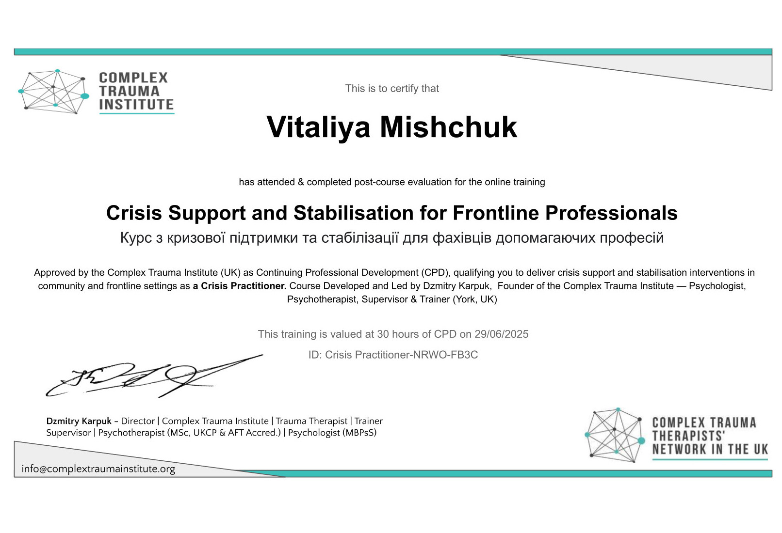 - Сертифікат Complex Trauma Institute (The UK) - Кризове консультування з 2025 року