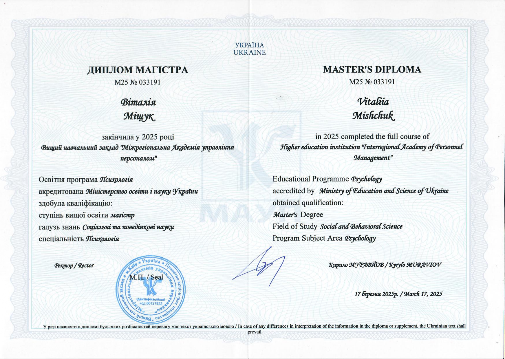 - Міжнародна Академія Управління Персоналом - магістр психології в 2025